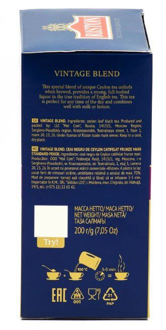Чай Riston Vintage Blend крупнолистовой черный, 8 пачек по 200 г