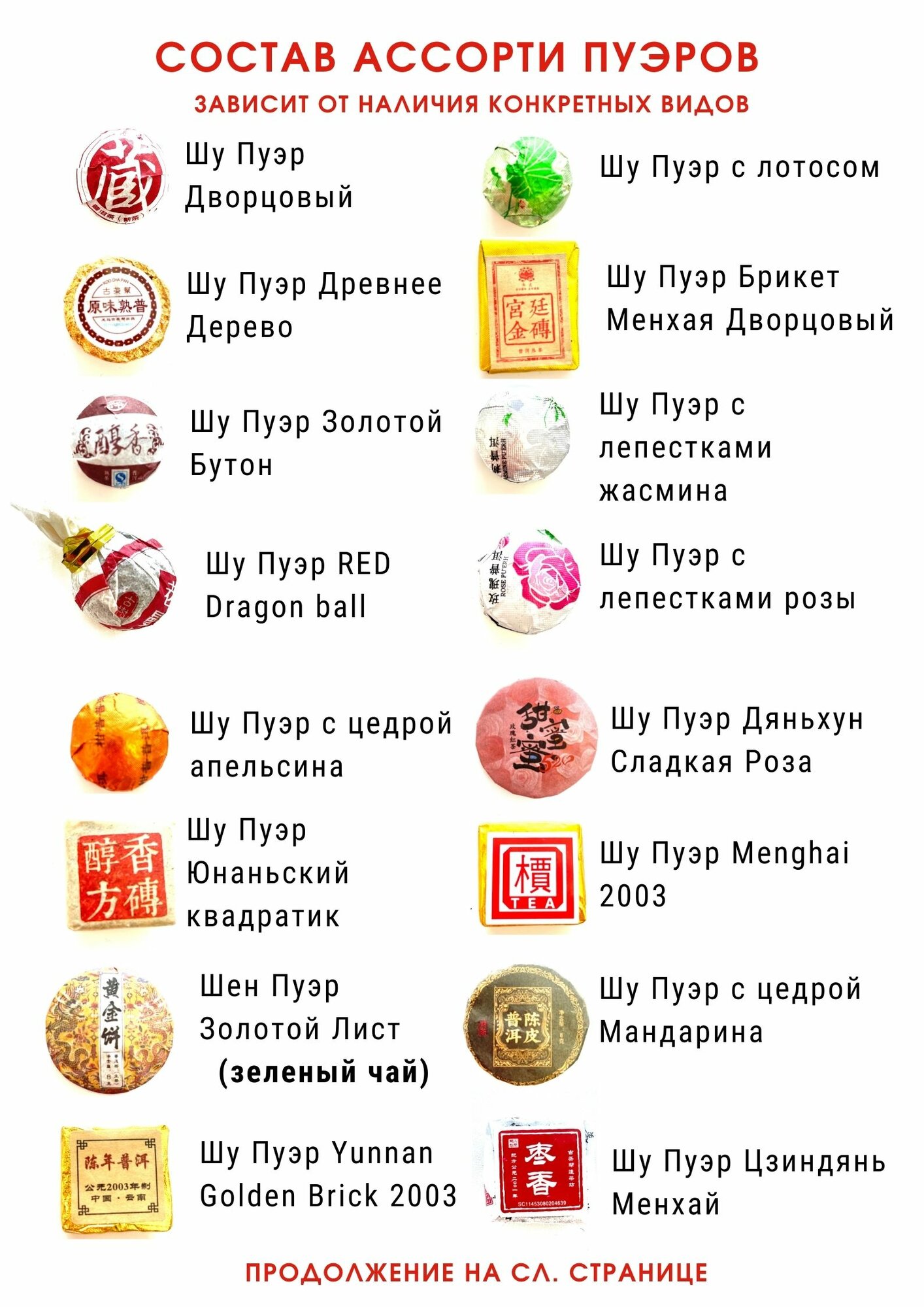 | Дополнительная информация | Китайский прессованный чай черный, зеленый шу и шен пуэр |