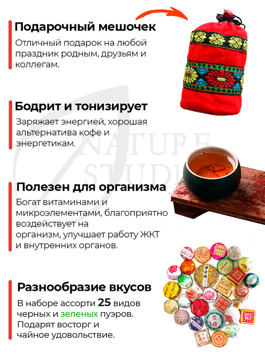 | Состав набора | ассорти черного и зеленого пуэров, ассорти шу и шен пуэров, подарочный чай, подарочный набор чая |