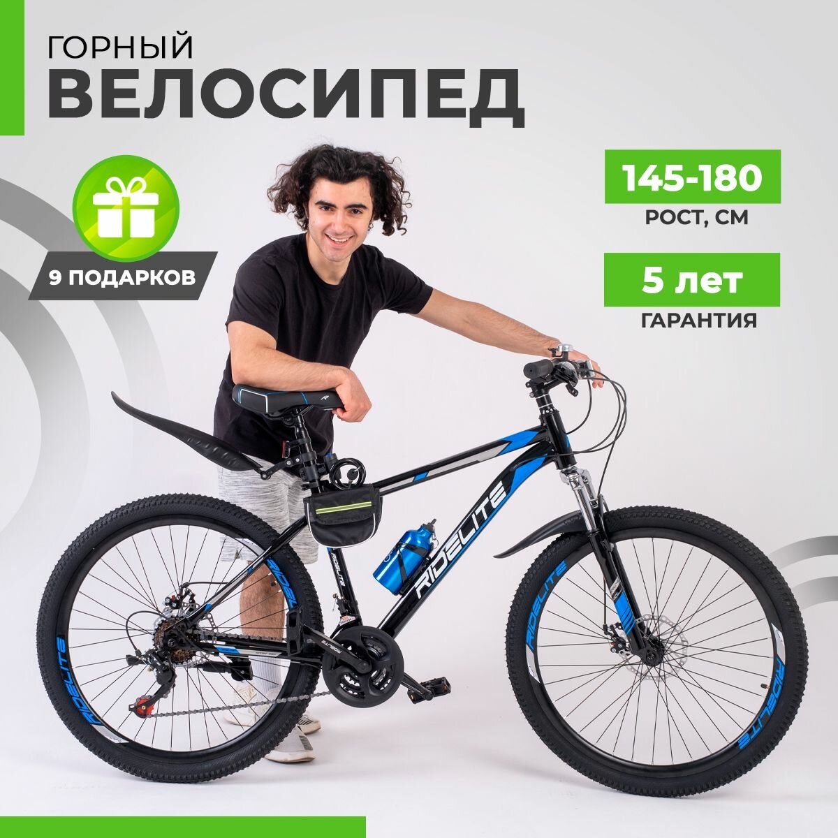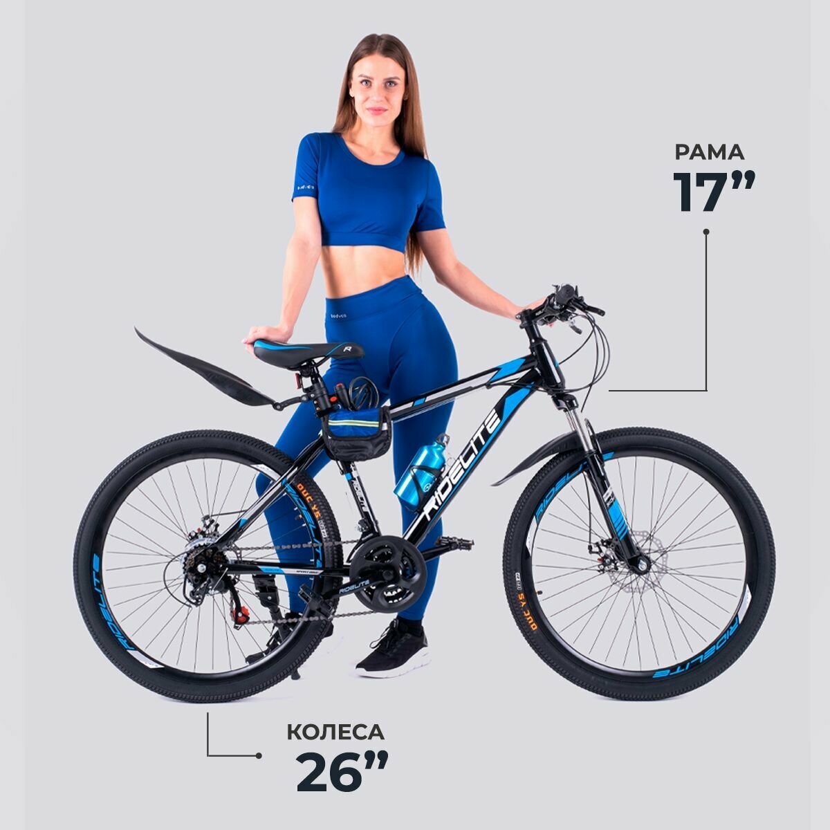 Купить Велосипед взрослый / подростковый мужской / женский, гравийный горный 26", RIDELITE 21ск черно-синяя рама 17", рост 140-180 см