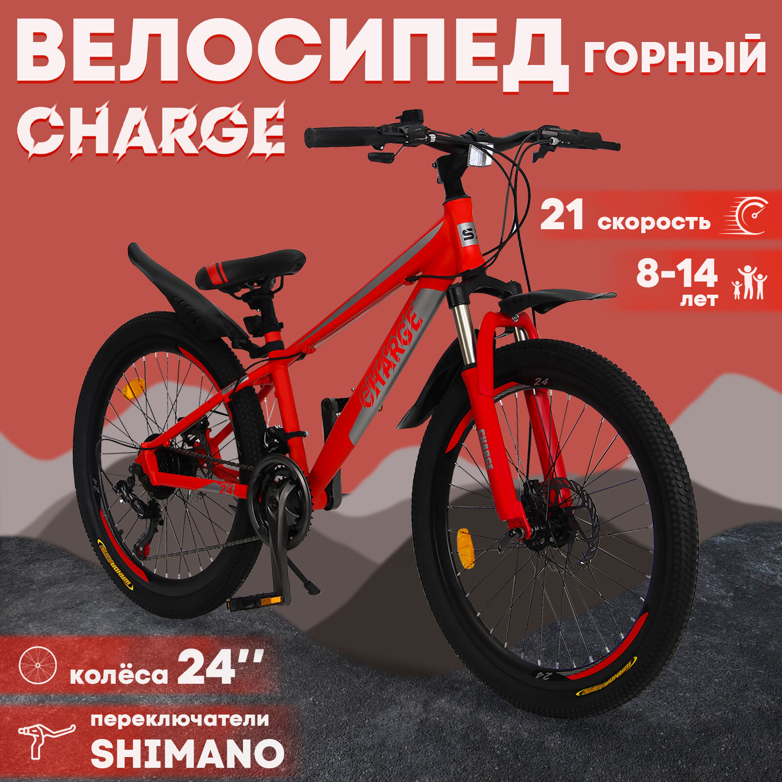 Горный велосипед детский скоростной Charge 24" красный, 8-14 лет, 21 скорость (Shimano tourney) интересное: