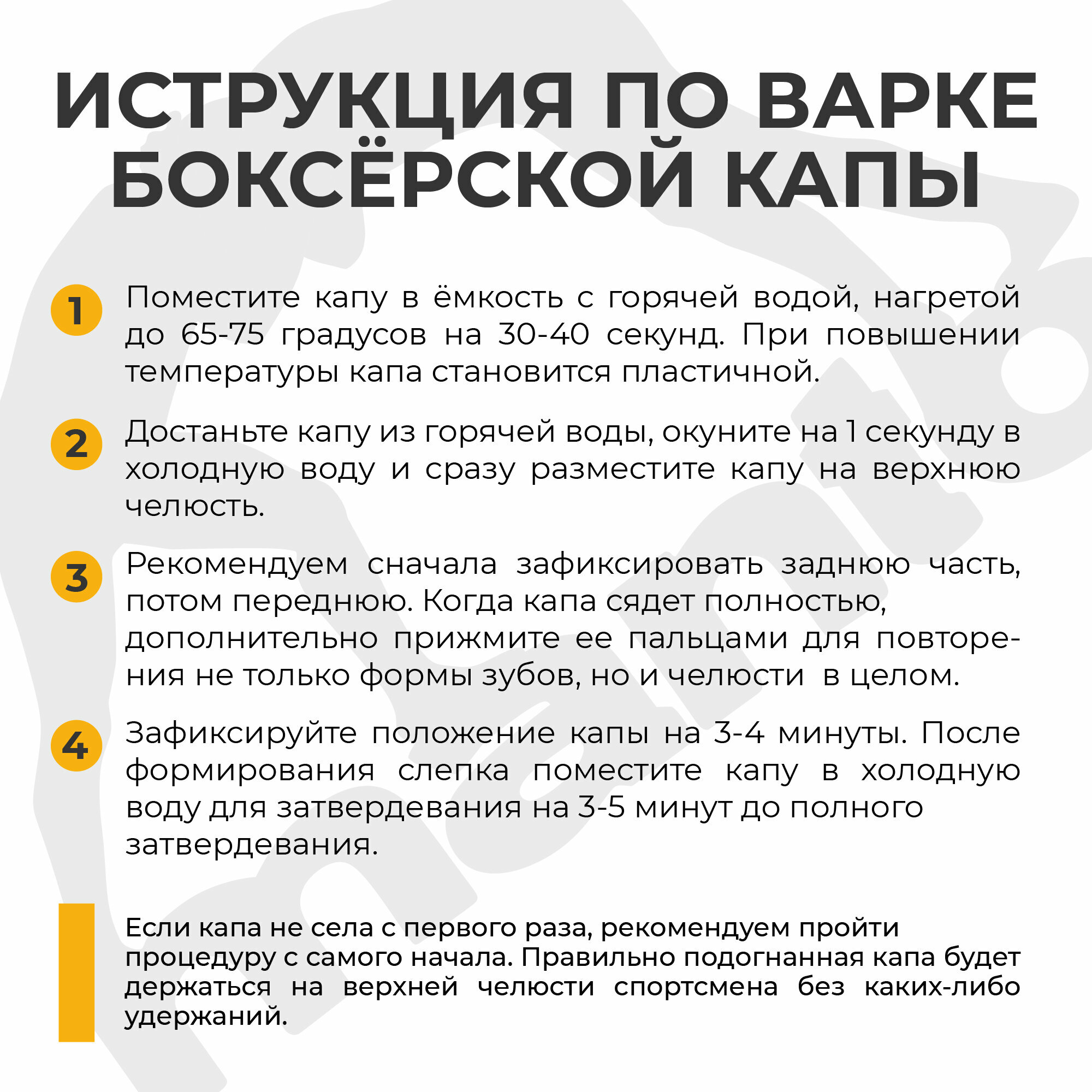 | Дополнительная информация | вид запчасти: Капа для бокса; подробная комплектация: Боксерская капа Чехол для хранения и транспортировки. |
