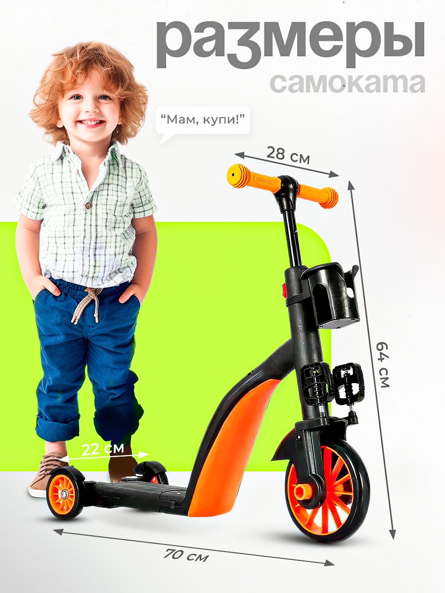 Самокат трехколесный 3в1 детский регулируемый беговел велосипед , черный оранжевый интересное: