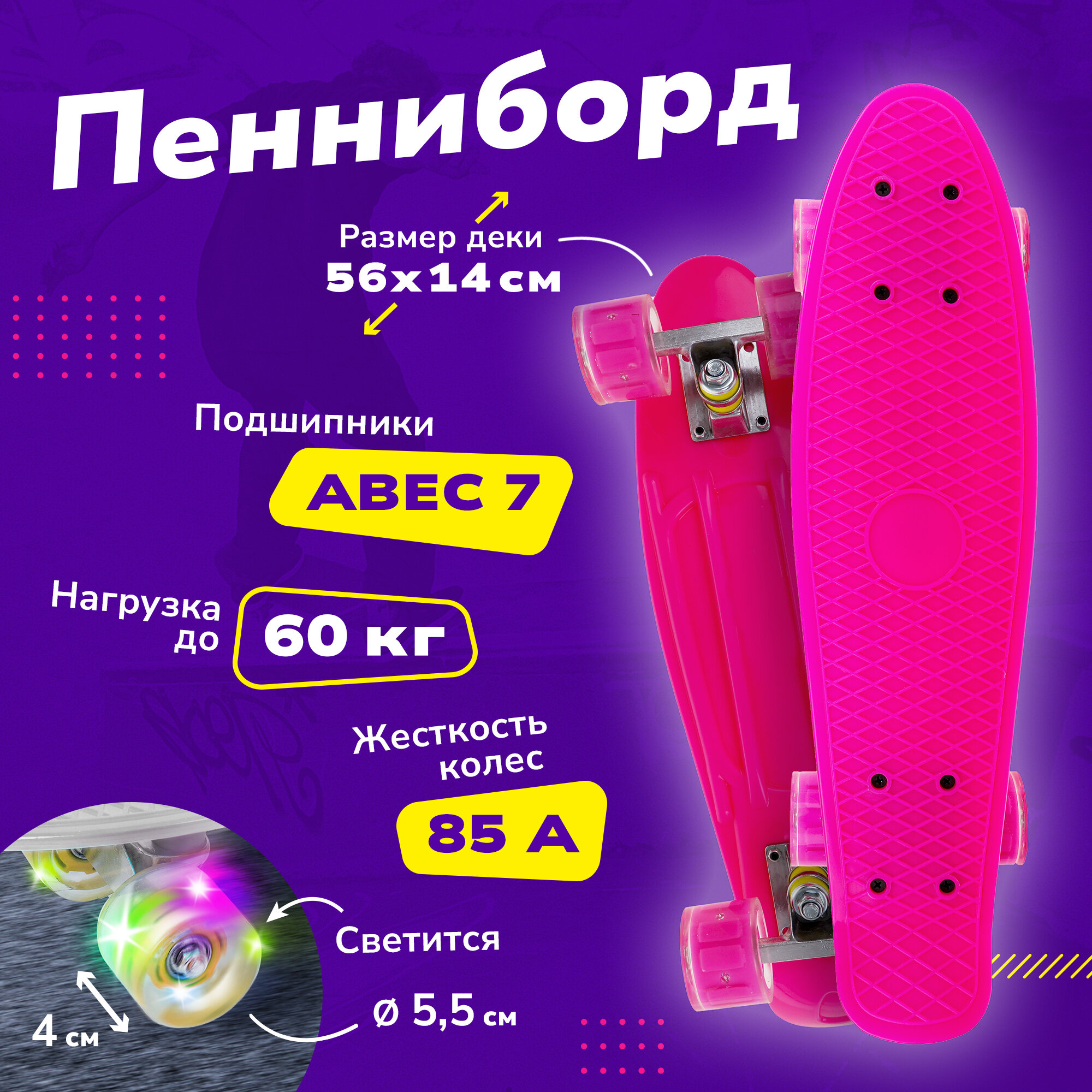 Скейтборд пластик 56 см, колеса PU со светом, крепления алюмин., розовый