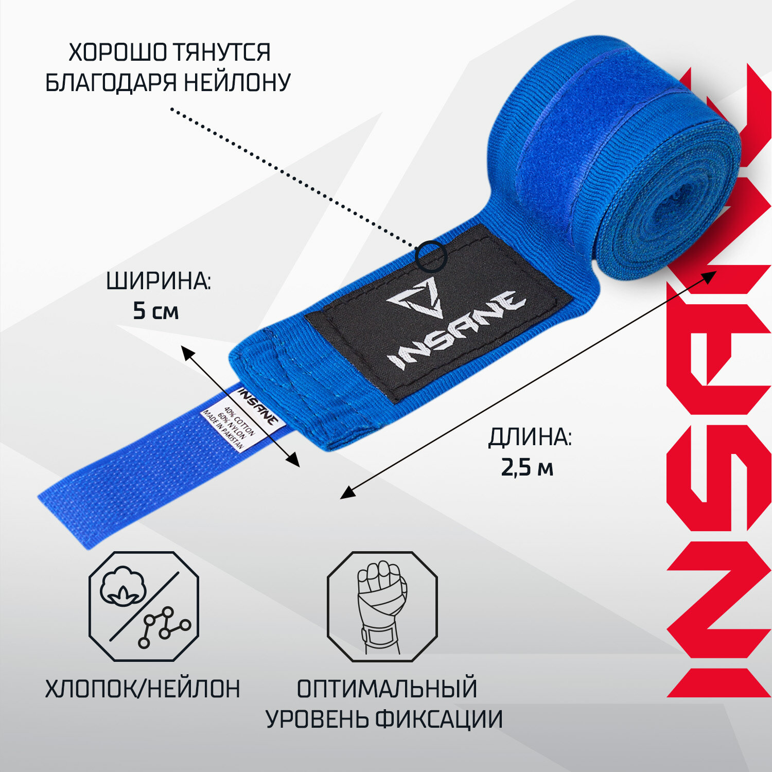 Купить Бинт боксерский INSANE COBRA IN22-HW201, хлопок/нейлон, синий, 2,5 м