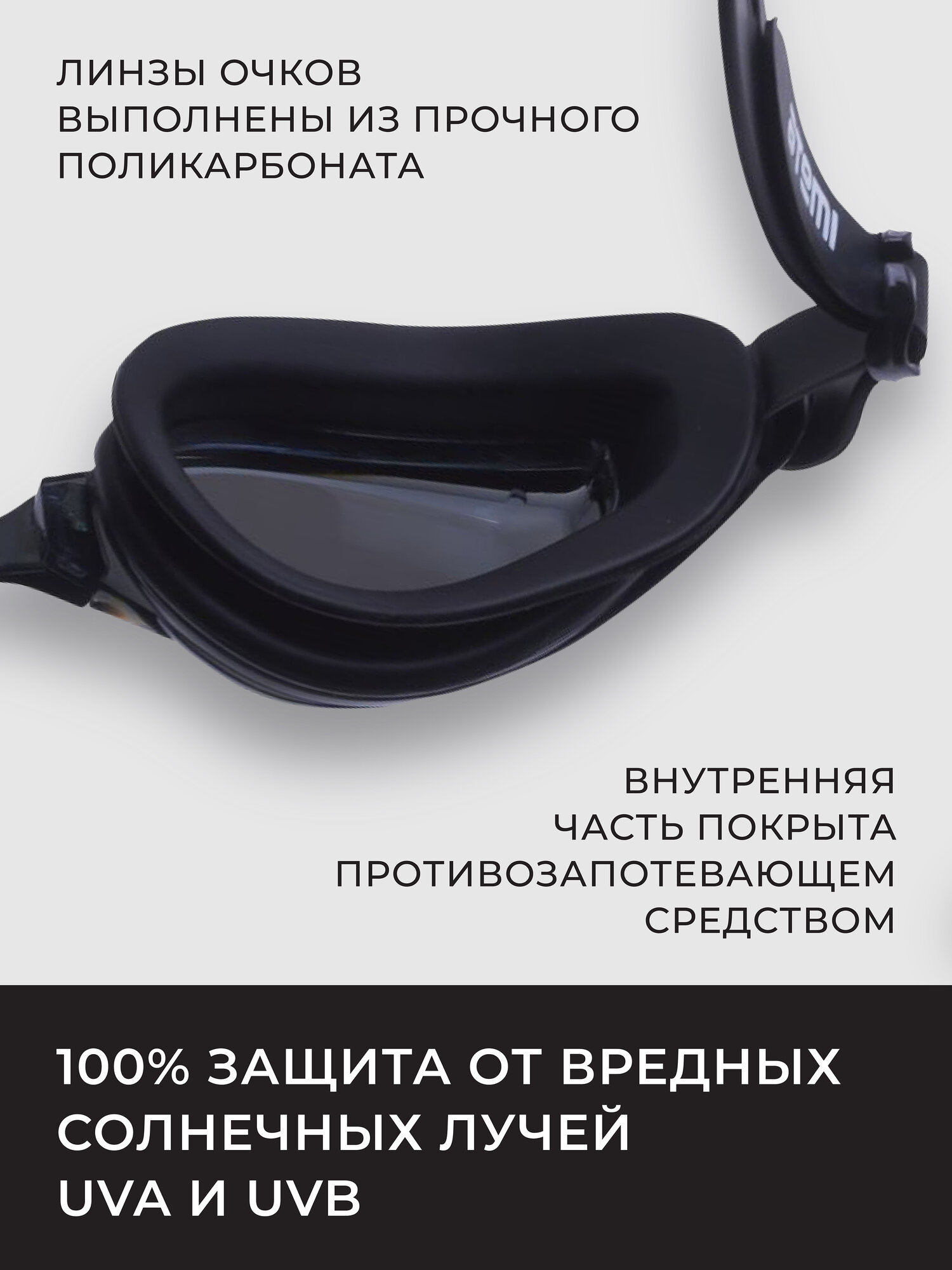 | Дополнительная информация | силикон (100% гипоаллергенный); поликарбонат с противозапотевающим покрытием внутренней поверхности линз; 100% защита от UVA, UVB; |