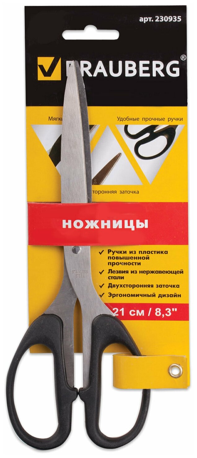 Ножницы BRAUBERG "Classic", 210 мм, чёрные, классической формы, 2-х сторонняя заточка, 230935, 230935