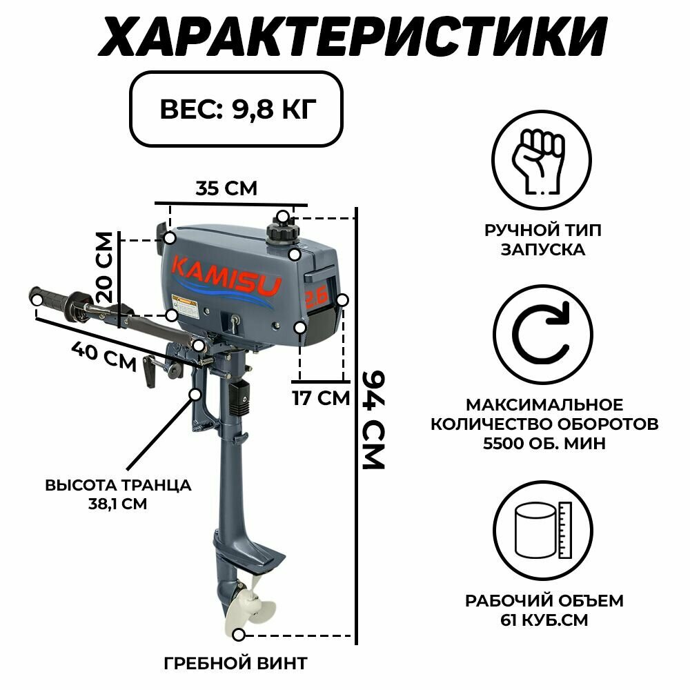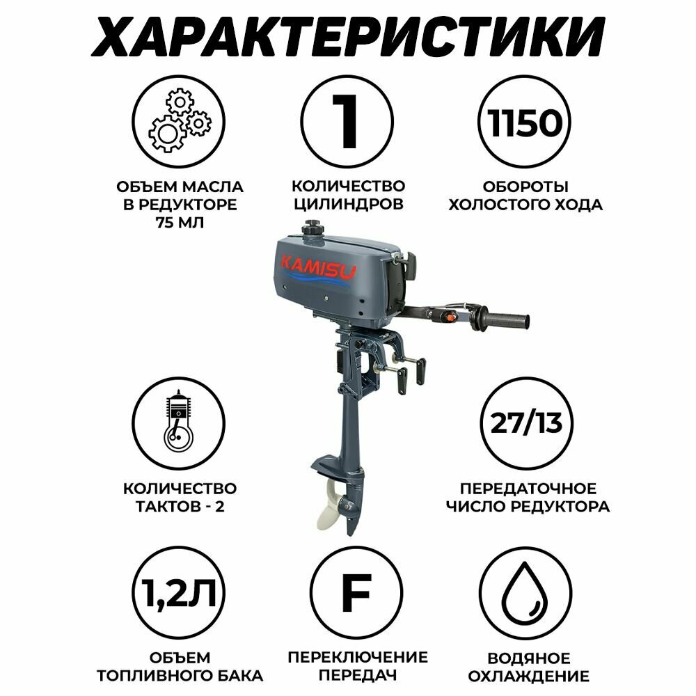 Подвесной лодочный мотор KAMISU T2.6BMS, бензиновый, двухтактный, 2.6 л.с., 1.5 кВт интересное:
