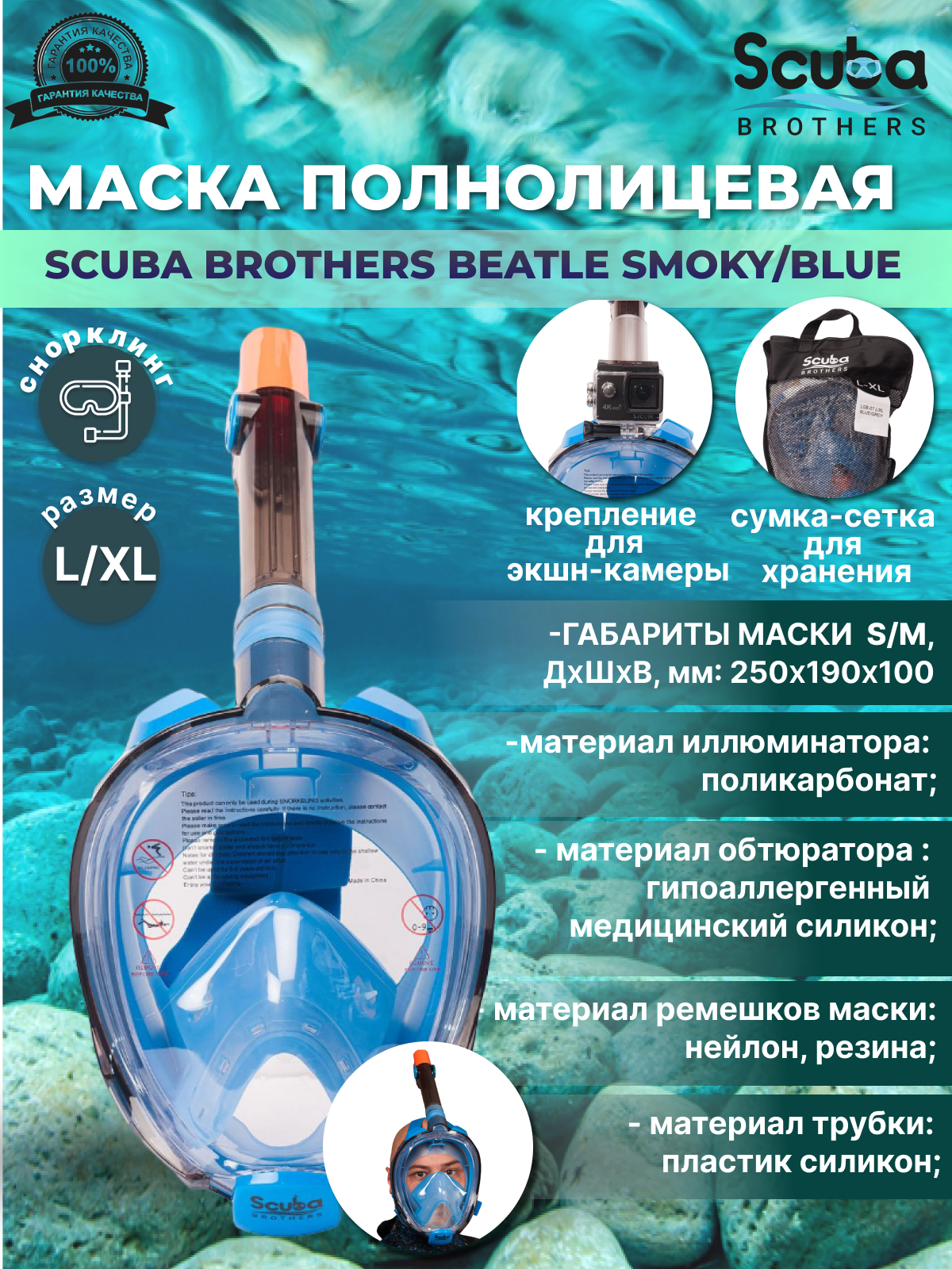 СохранитьМаска полнолицевая SCUBA BROTHERS BEATLE SMOKY/BLUE, с креплением экшн-камеры , р-р L/XL интересное:
