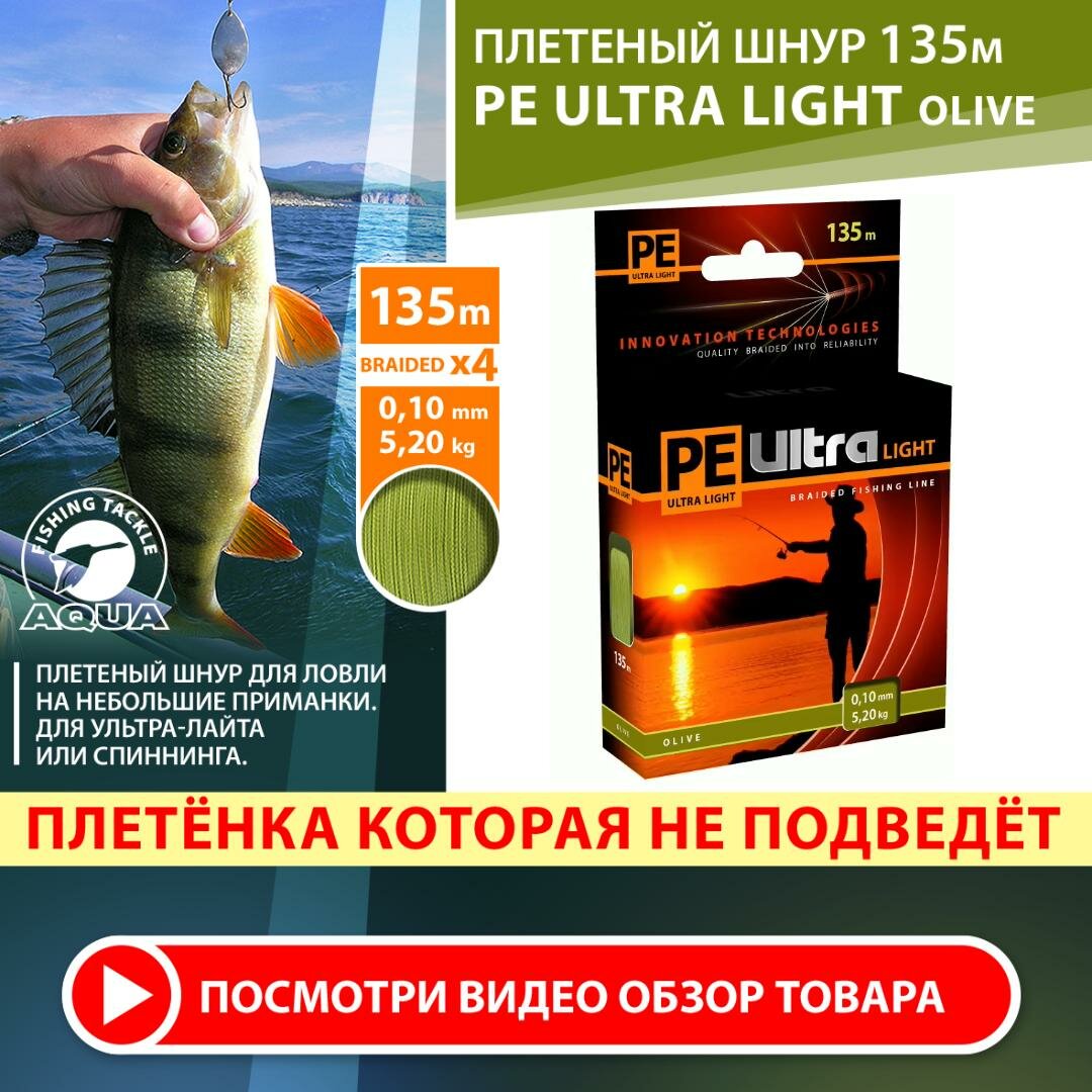 Ниже Вы можете прочитать отзывы на Плетеный шнур для рыбалки AQUA PE Ultra Light Olive 135m 0.10mm 5.2kg, ознакомится с подробными характеристиками, посмотреть интересные обзоры и фотографии на Плетеный шнур для рыбалки AQUA PE Ultra Light Olive 135m 0.10mm 5.2kg.