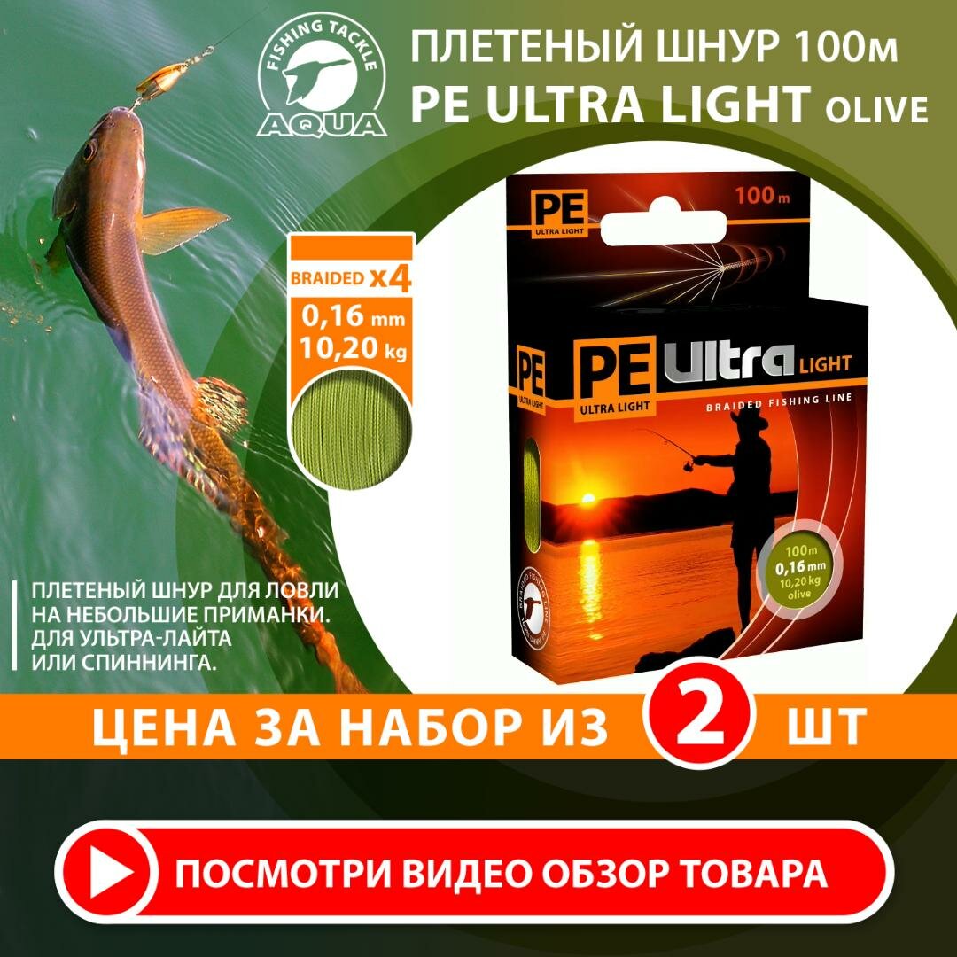Ниже Вы можете прочитать отзывы на Плетеный шнур для рыбалки AQUA PE Ultra Light Olive 100m 0.16mm 10.2kg 2шт, ознакомится с подробными характеристиками, посмотреть интересные обзоры и фотографии на Плетеный шнур для рыбалки AQUA PE Ultra Light Olive 100m 0.16mm 10.2kg 2шт.