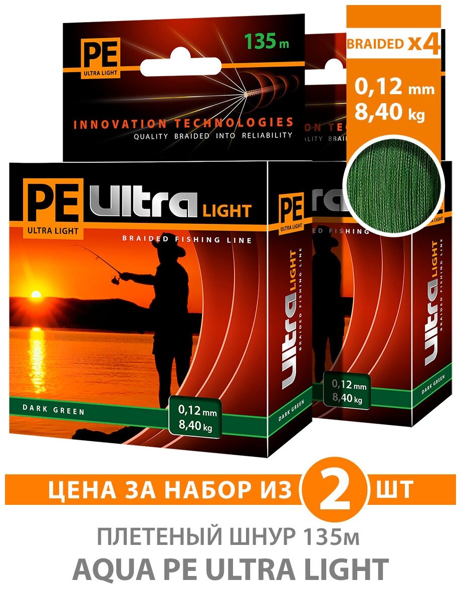 Плетеный шнур для рыбалки AQUA PE ULTRA LIGHT Dark Green 0,12mm 135m 2 шт. в комплекте