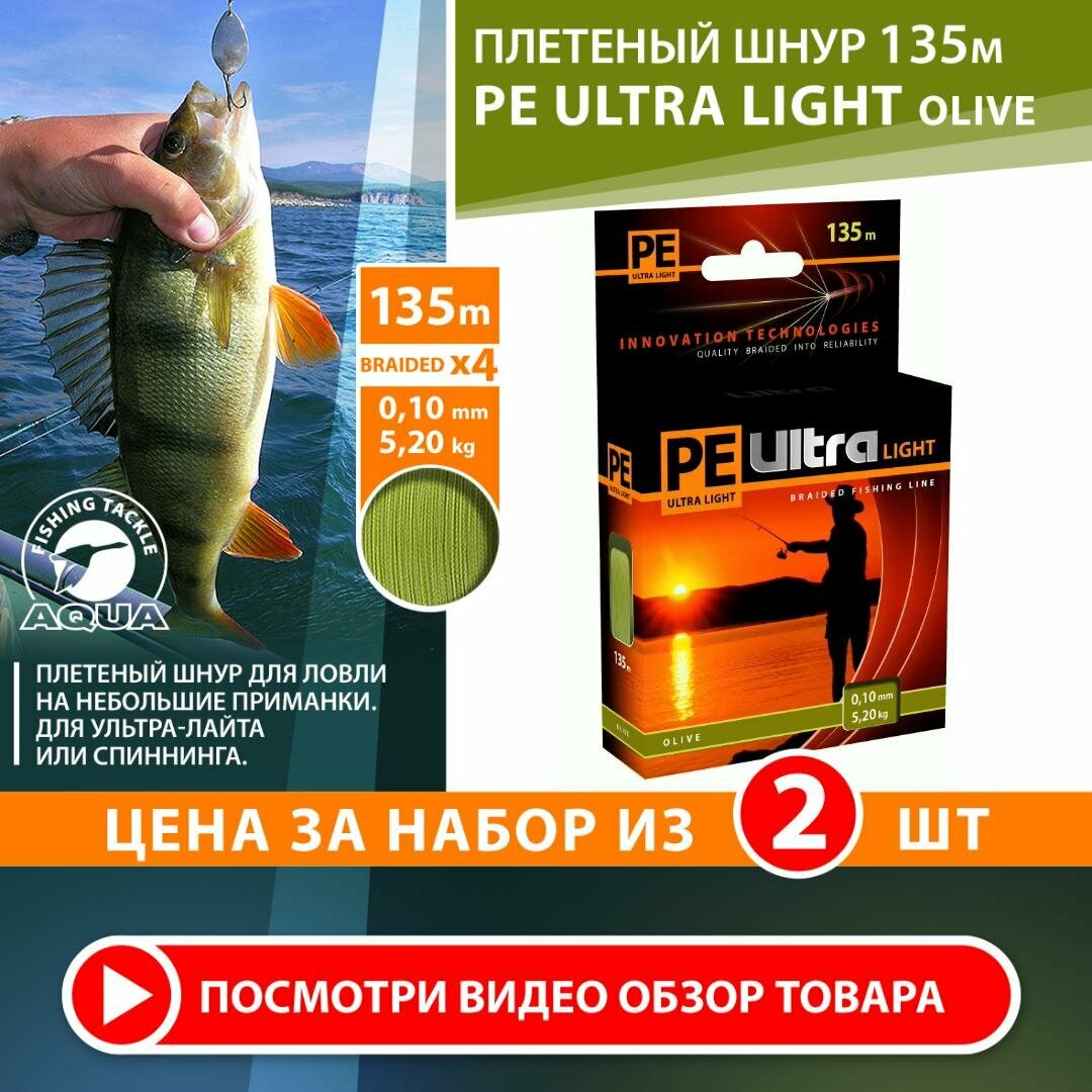 Плетеный шнур для рыбалки AQUA PE ULTRA LIGHT Olive 0,04 мм, 135 м для катушки спиннинга, 2 шт в комплекте