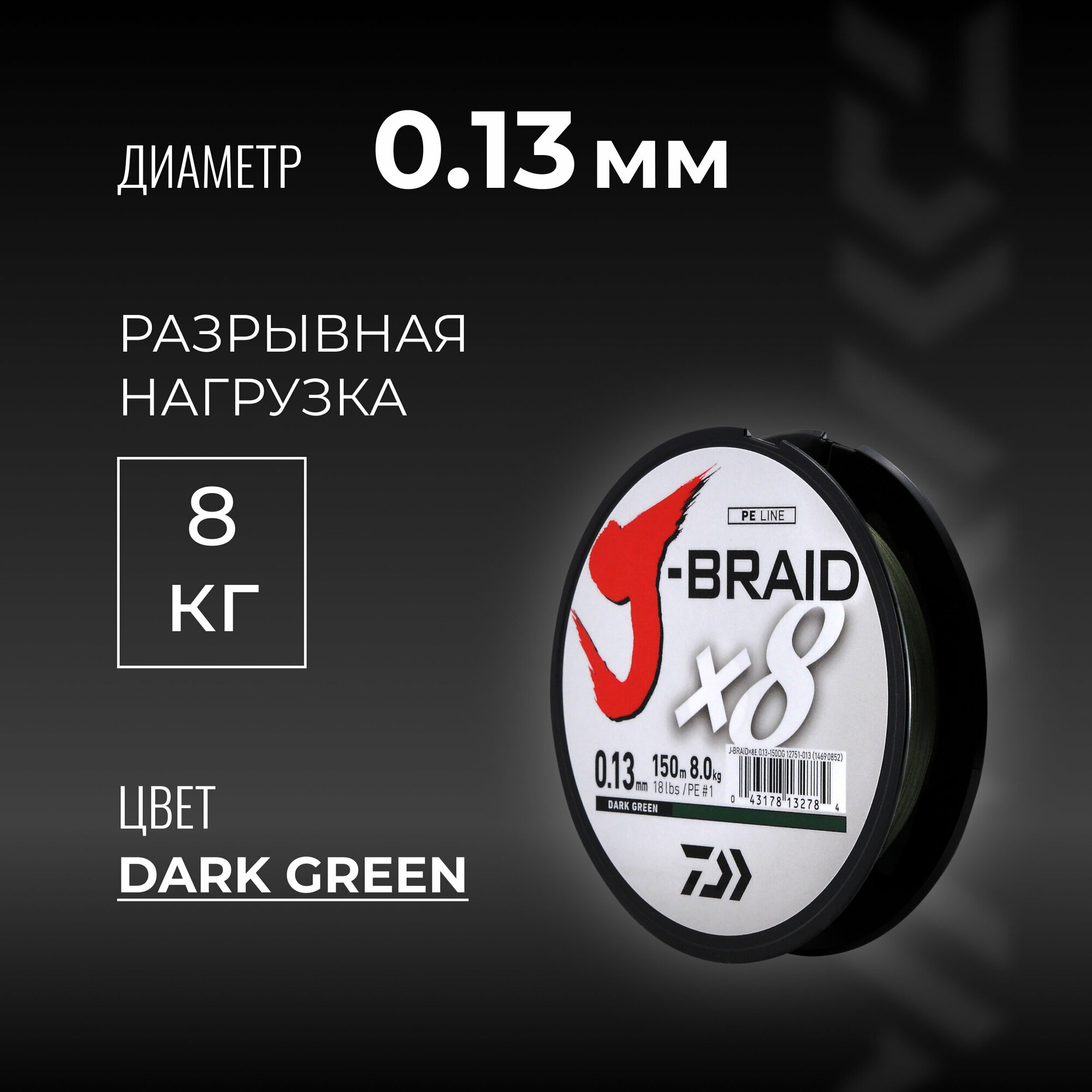 Плетеный шнур Daiwa J-Braidx8, 0.13 мм, 8.0 кг, 150 м, тёмно-зелёный