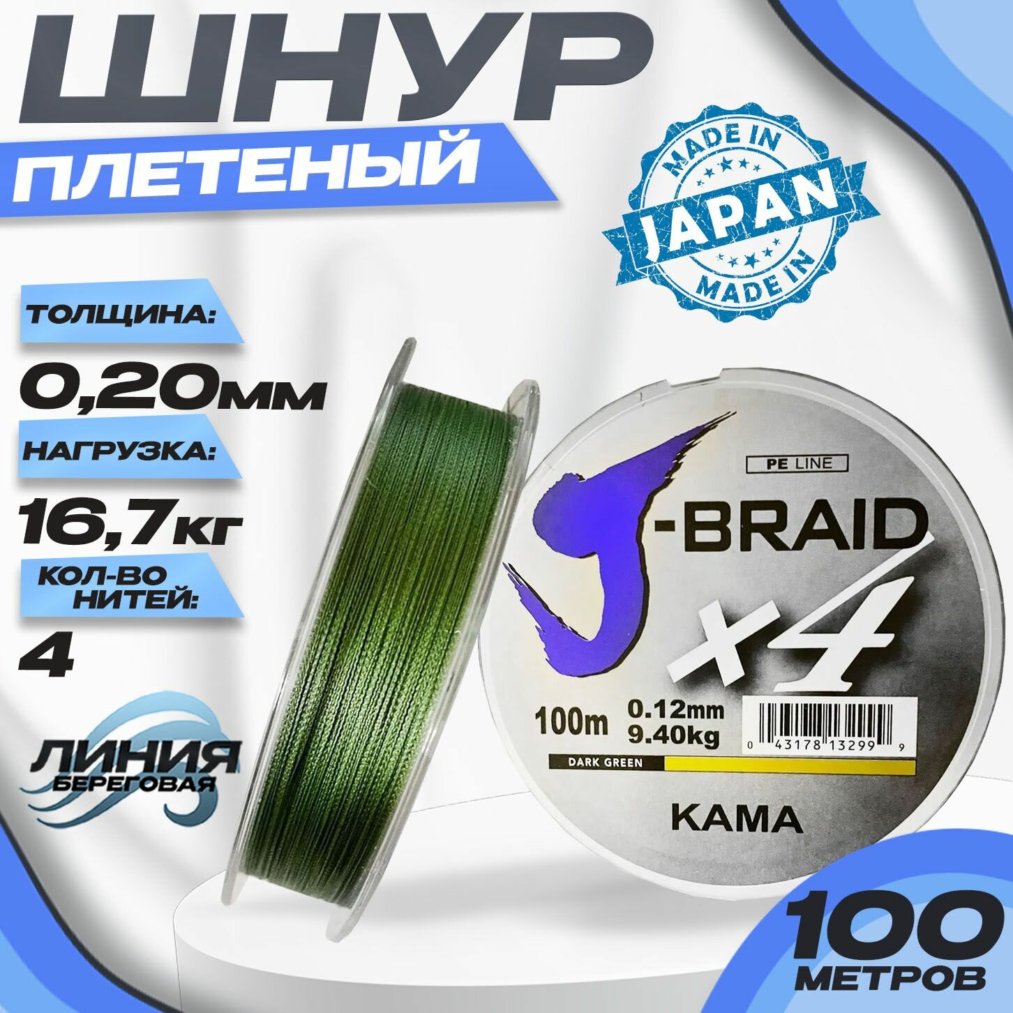 Купить Шнур плетеный для рыбалки 0.20 мм 16,7 кг J-BRAID X4 Made in Japan Четырехжильный