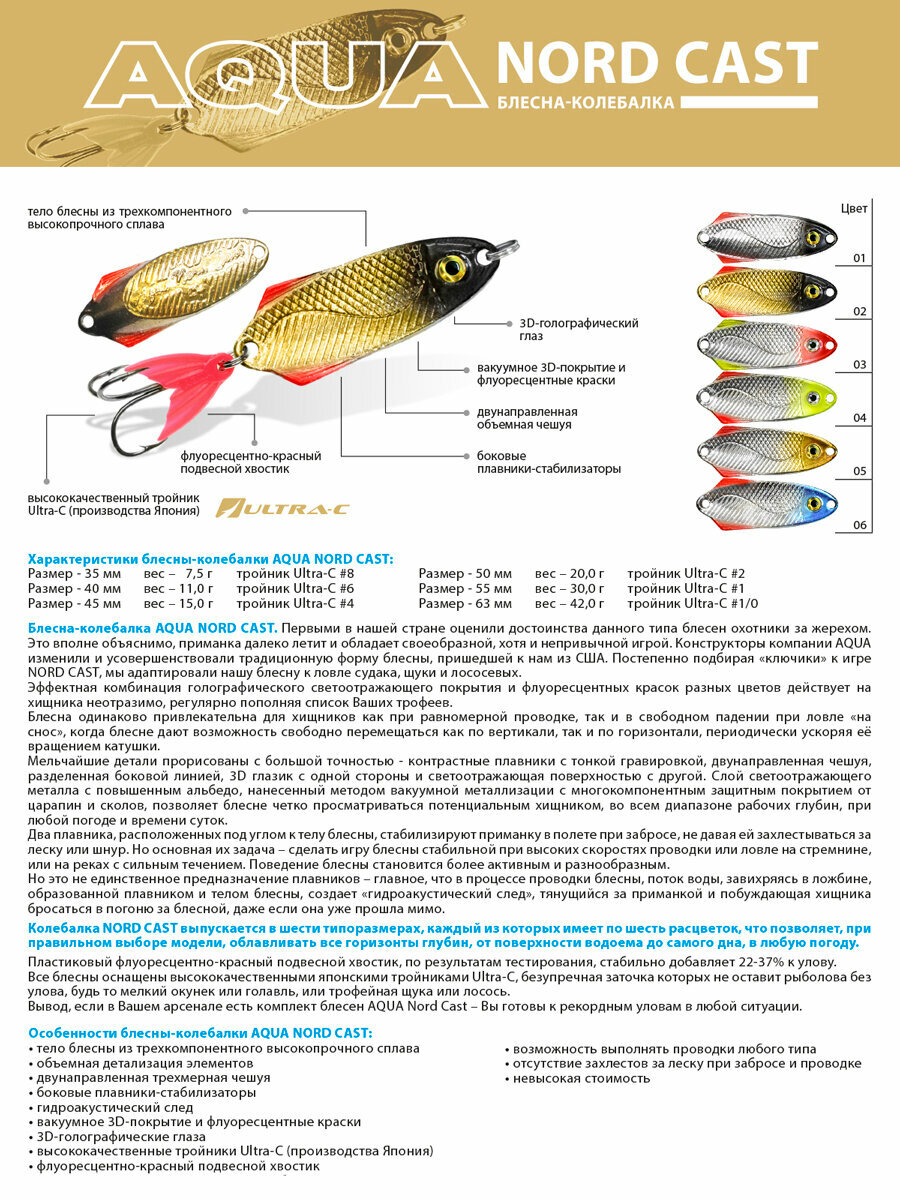 Блесна колебалка для рыбалки AQUA Nord Cast 45mm 15g цвет 01