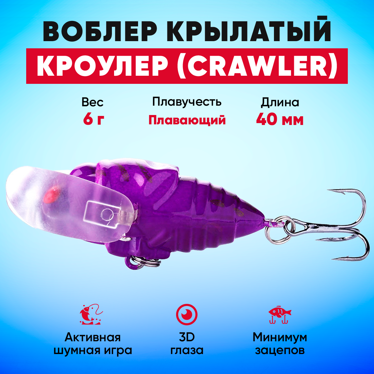Купить Воблер Кроулер (Crawler) крылатый плавающий на щуку, окуня, жереха (6 г 40 мм) фиолетовый