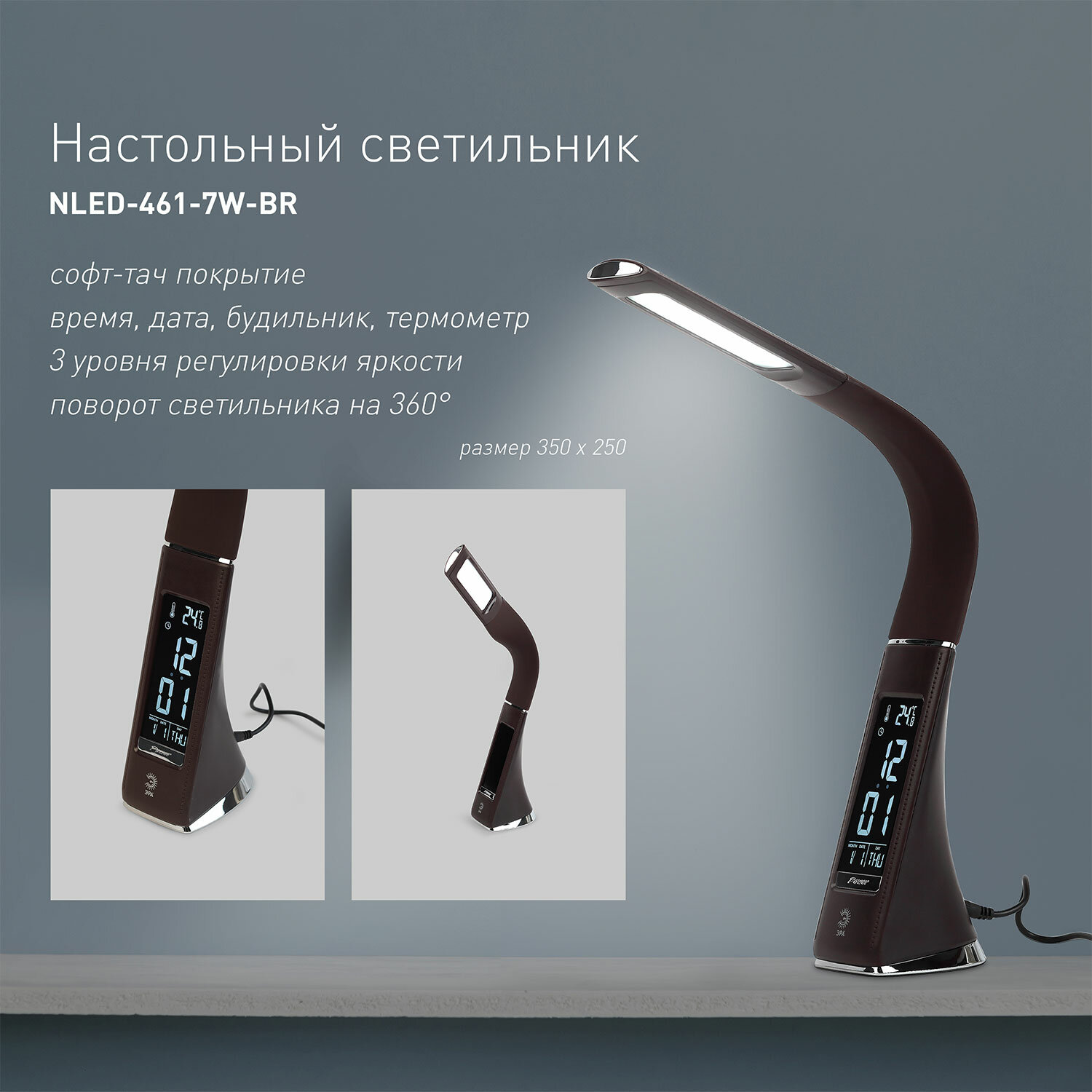 Офисная настольная лампа светодиодная с диммером и выключателем термометром будильником и часами NLED-461-7W-BR (ЭРА)