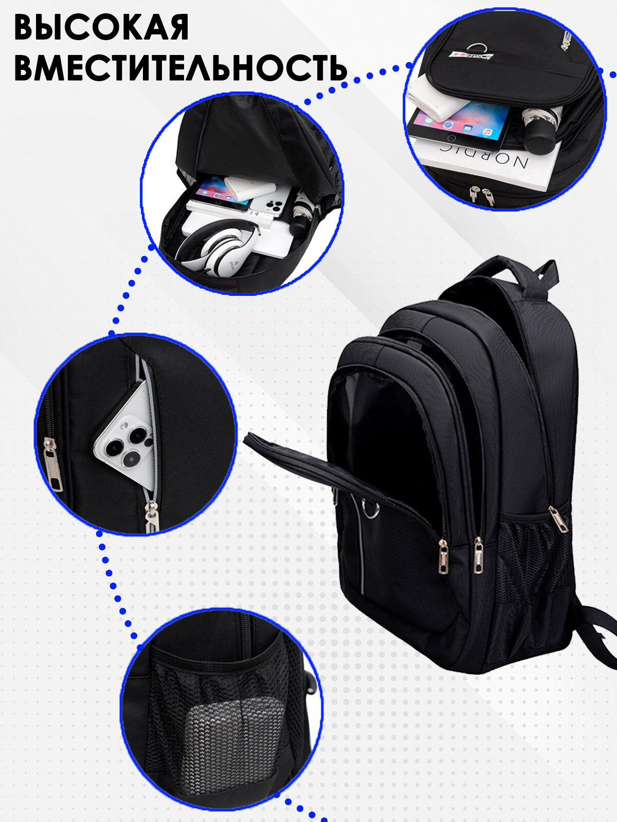 | Конструктивные особенности | USB-выход / анатомический / вентилируемые лямки / вентиляция спины / верхний карман / внутренний карман / две лямки / мягкий / непромокаемое дно / ручка сверху / эргономичная спинка / эргономичные лямки |
