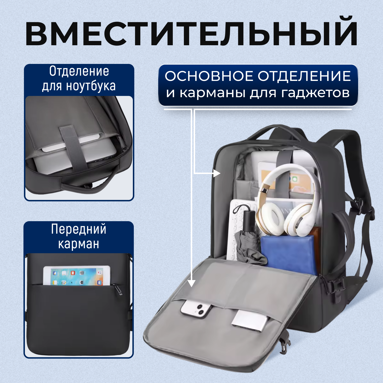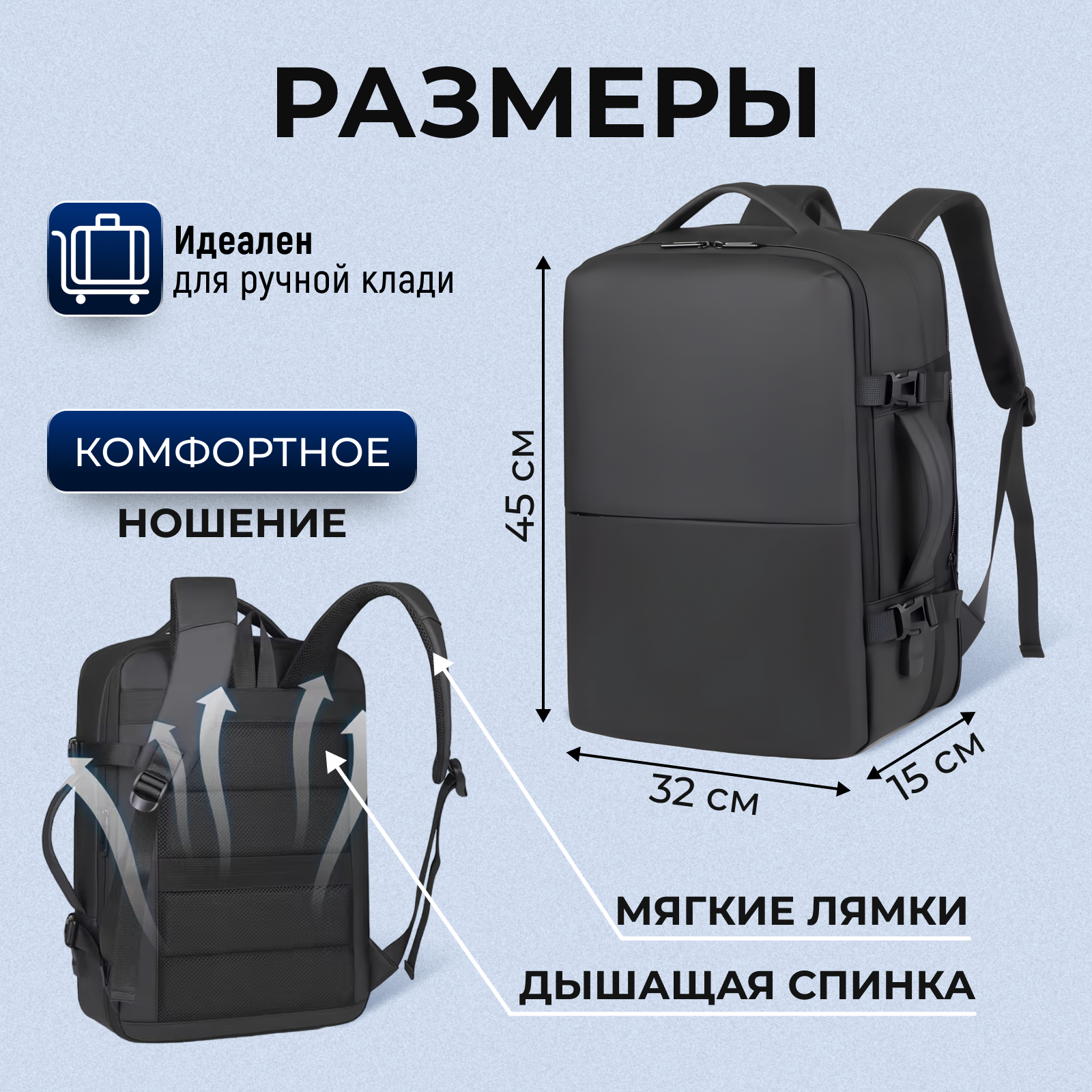 | Предметы | cъемный чехол для ПК, карман для бутылки, карман для документов, карман для планшета, карман для телефона, отделение для ноутбука |