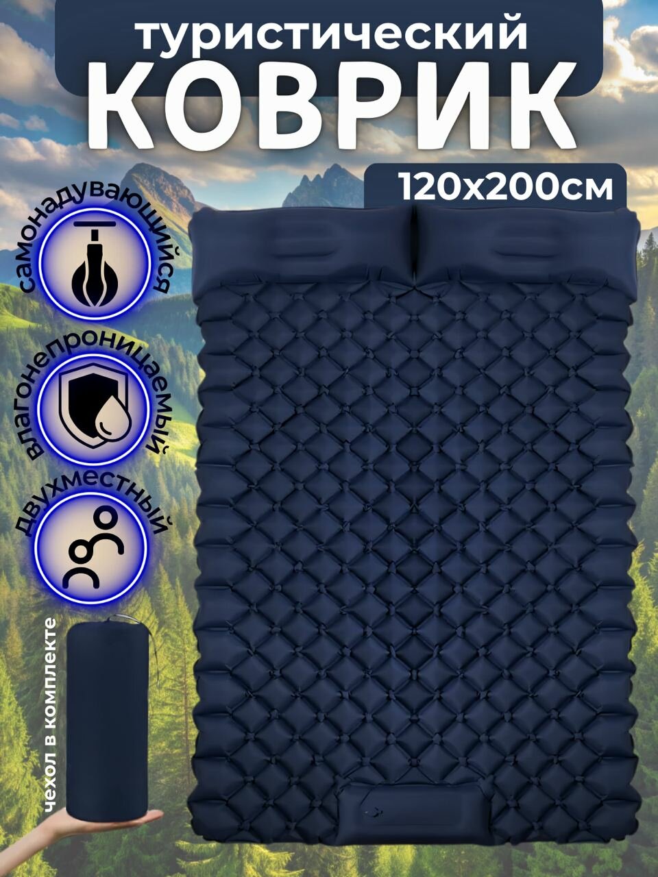 Кемпинговый надувной коврик для 2 человек / 2-хместный самонадувающийся матрас для отдыха на природе темно-синий интересное: