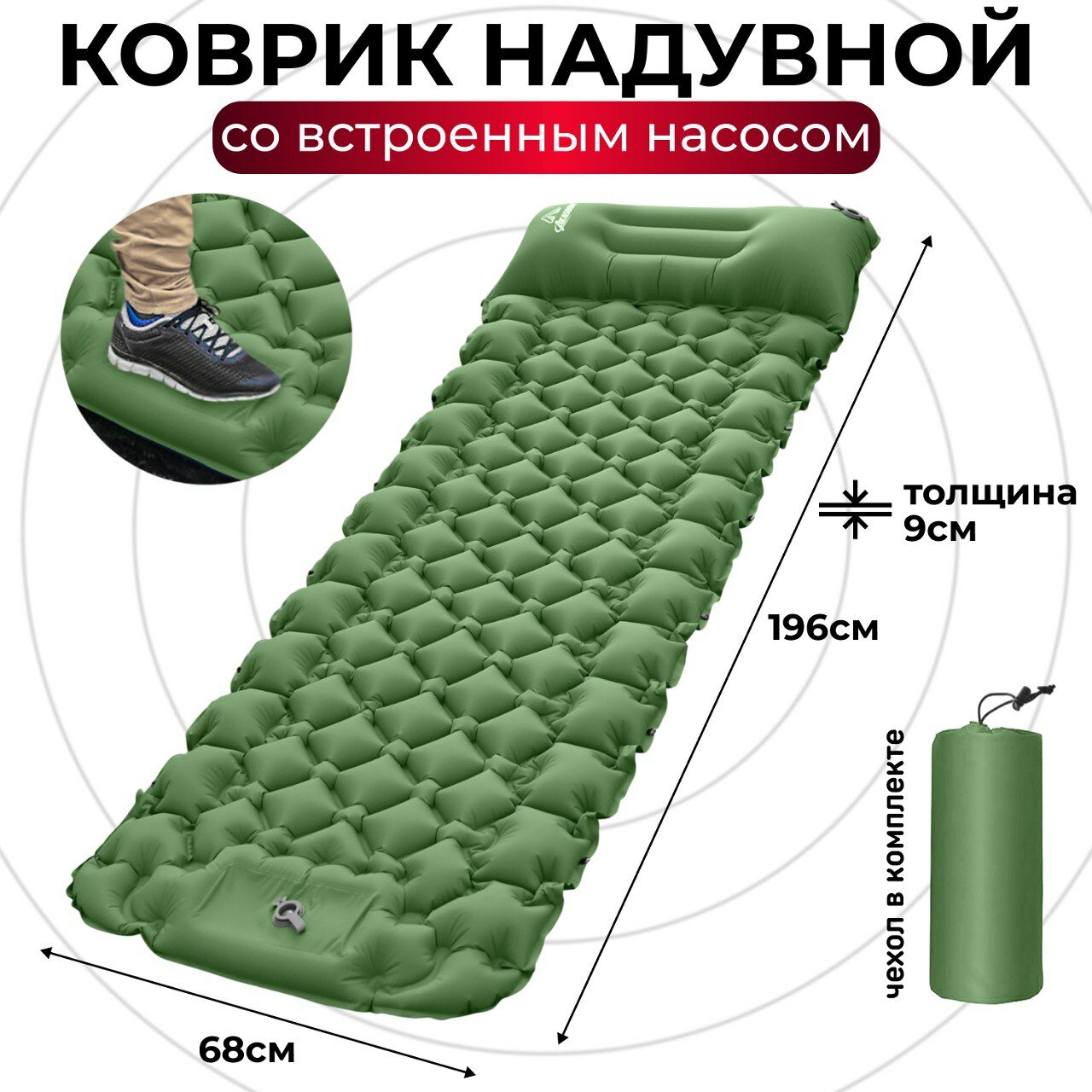 Туристический надувной коврик с насосом, с подушкой. Размер спального места: 192х60х9 см. зеленый интересное:
