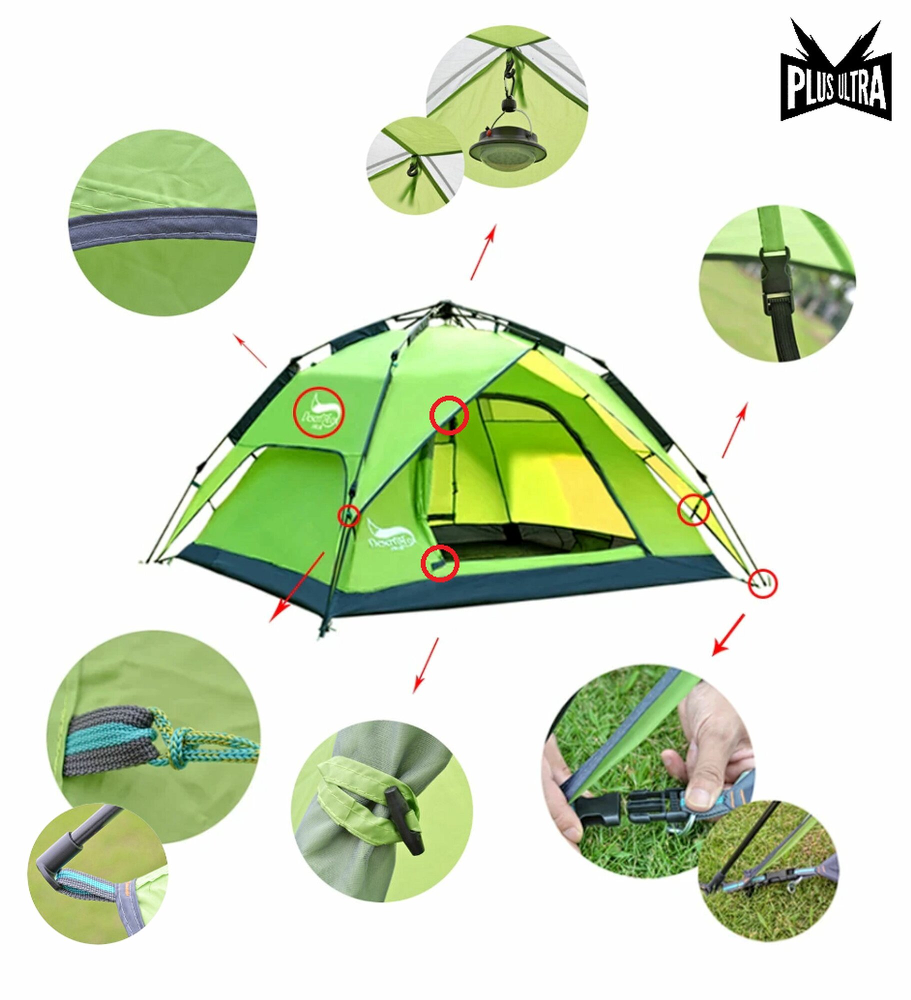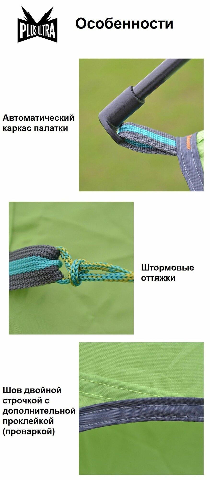 | Особенности | вентиляционные отверстия / внутренняя палатка / Возможность крепления фонарика / навес / огнеупорная пропитка / Подвесные полки / проклеенные швы / противомоскитная сетка / усиленные углы / штормовые оттяжки |