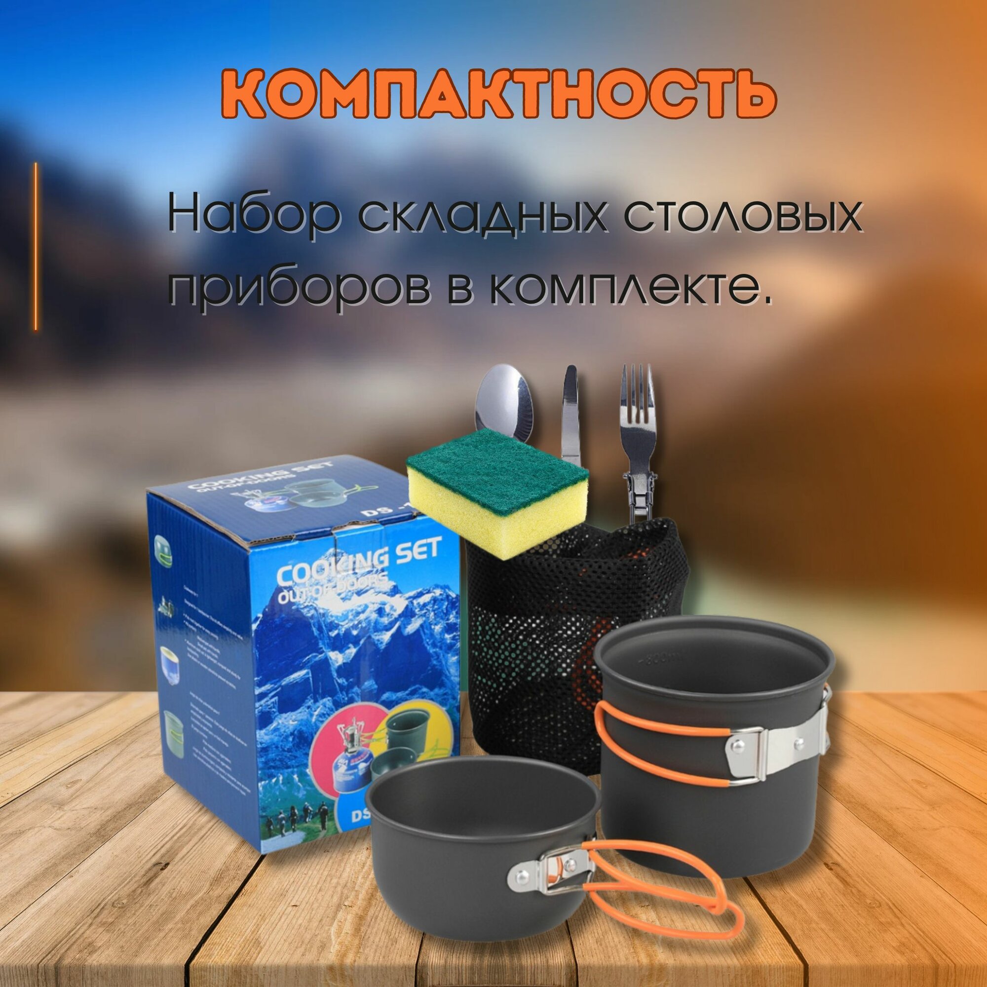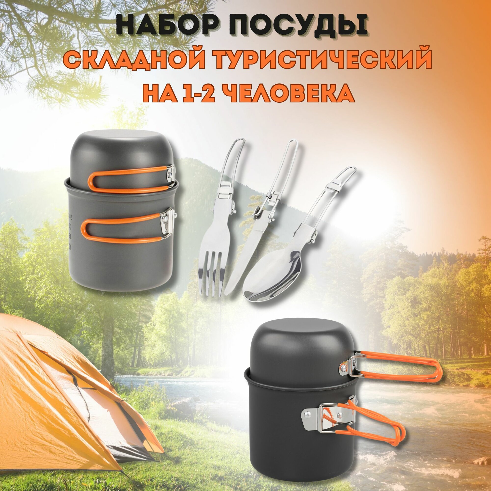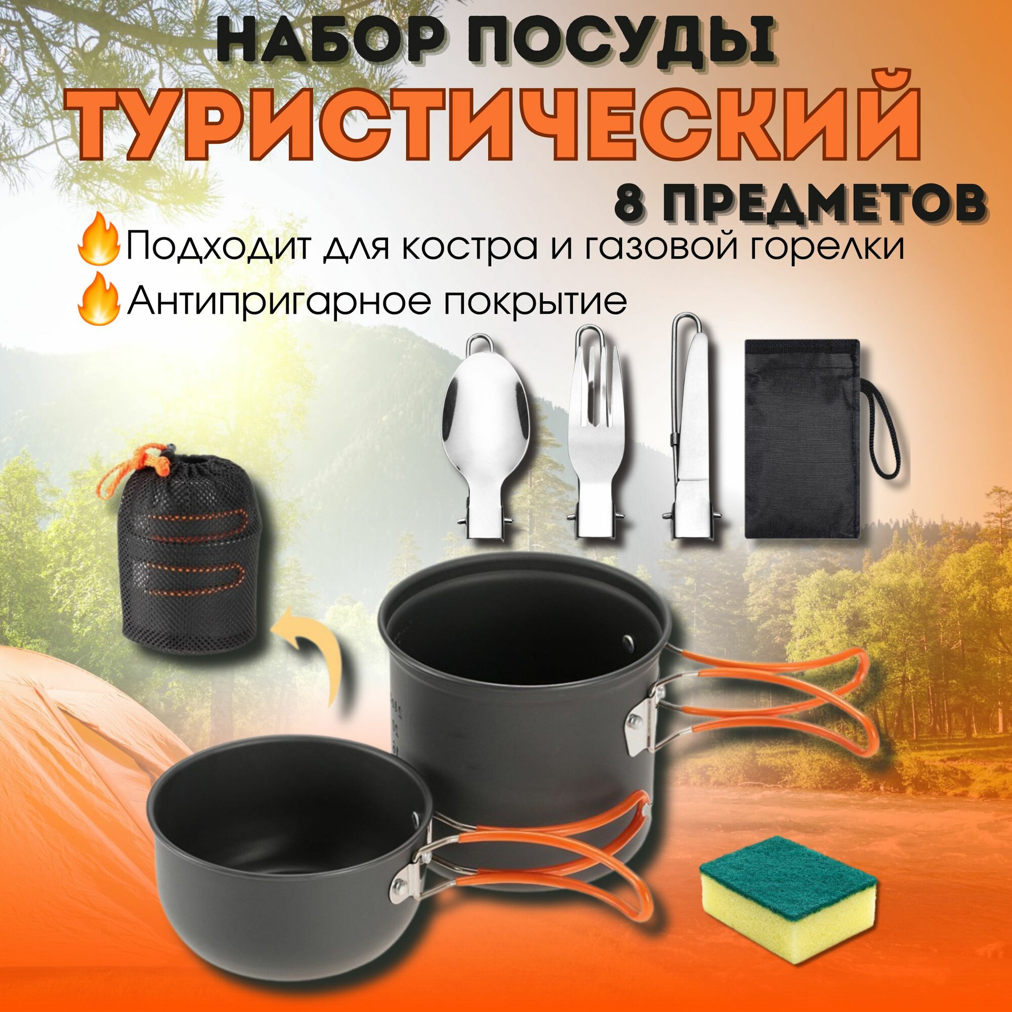 Набор туристической посуды / 8 предметов / походный набор посуды, для кемпинга, пикника, рыбалки, костра, складной интересное: