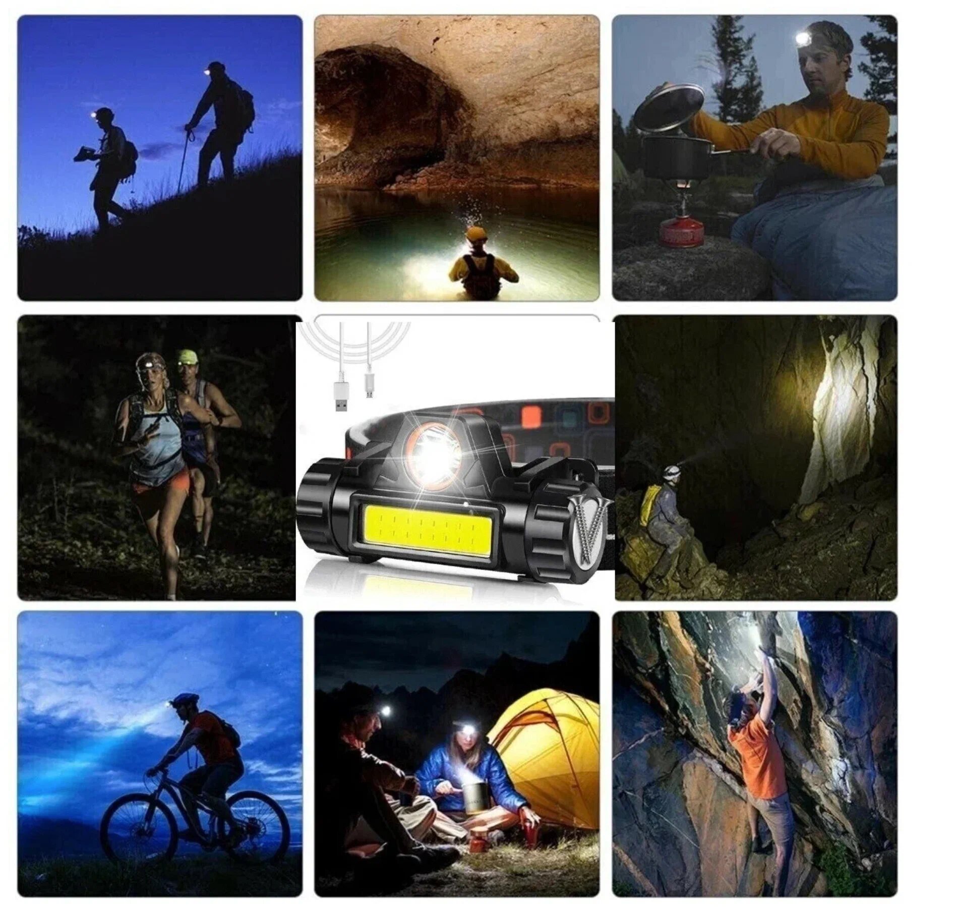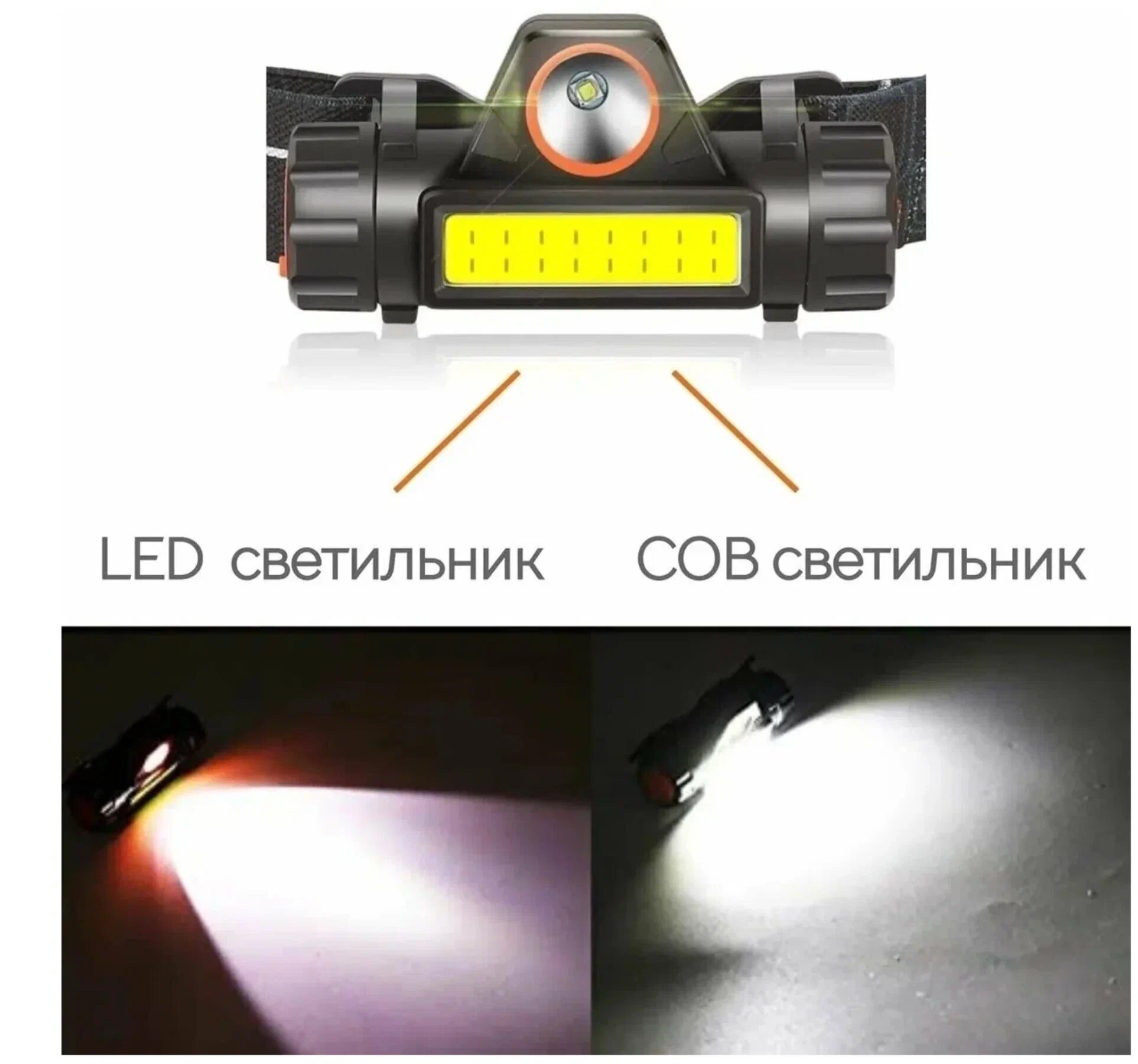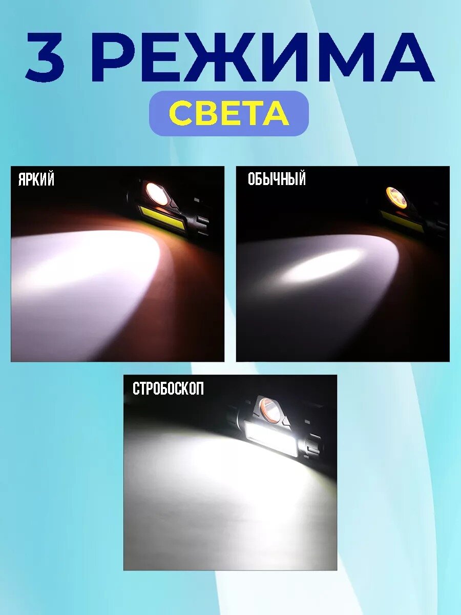 Фонарик налобный аккумуляторный светодиодный (гибкая COB панель + боковой светодиод, датчик движения, водонепроницаемый, зарядка USB)