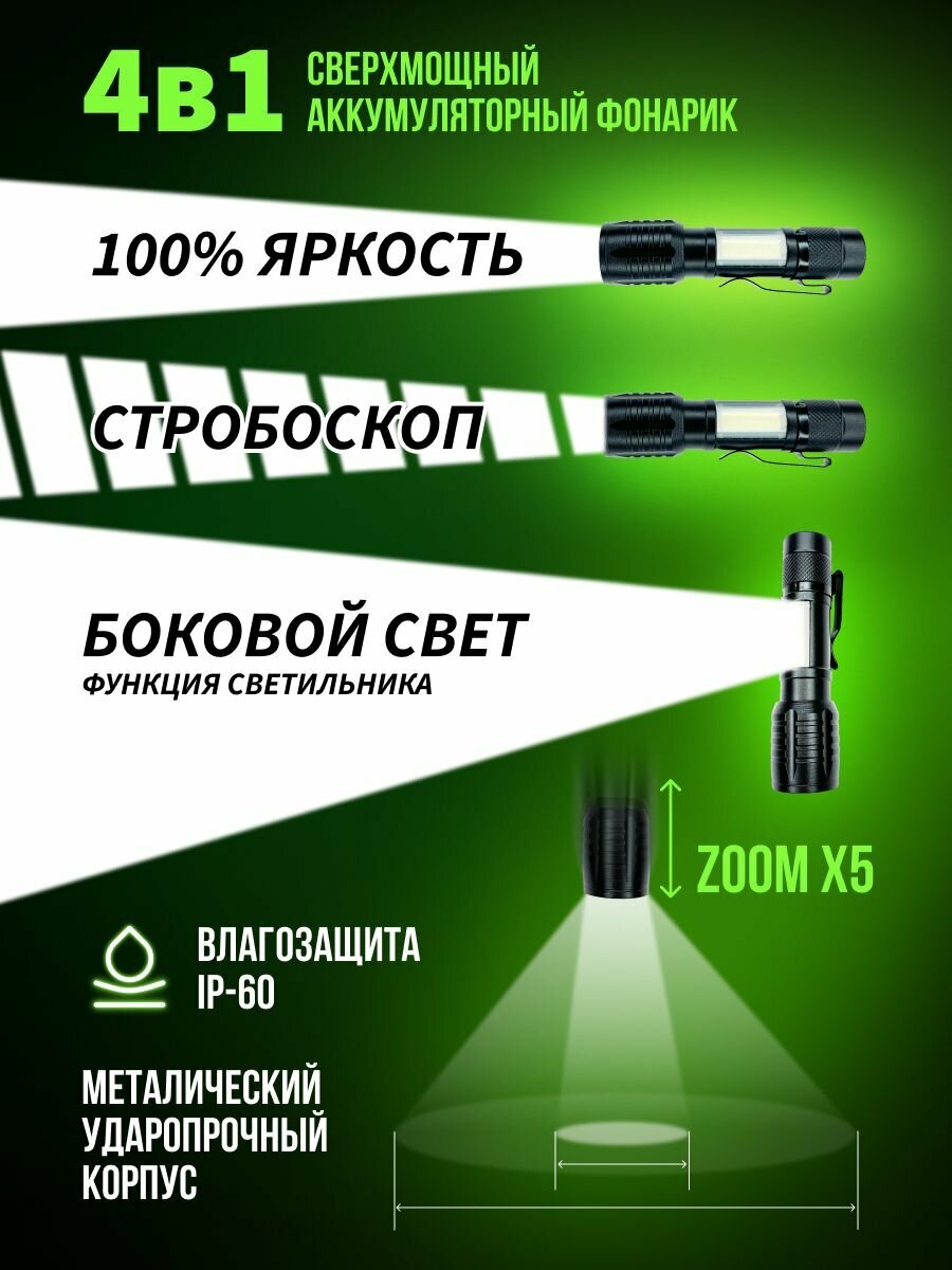 | Дополнительная информация | время зарядки аккумулятора: 1 ч; подробная комплектация: Фонарь 4в1, провод USB для зарядки, футляр пластиковый с двумя замками; количество батарей: 1; режимы работы: zoom фокусировка, режим бокового светильника, стробоскоп и сверхяркий направленный луч; емкость аккумулятора: 1200мА |