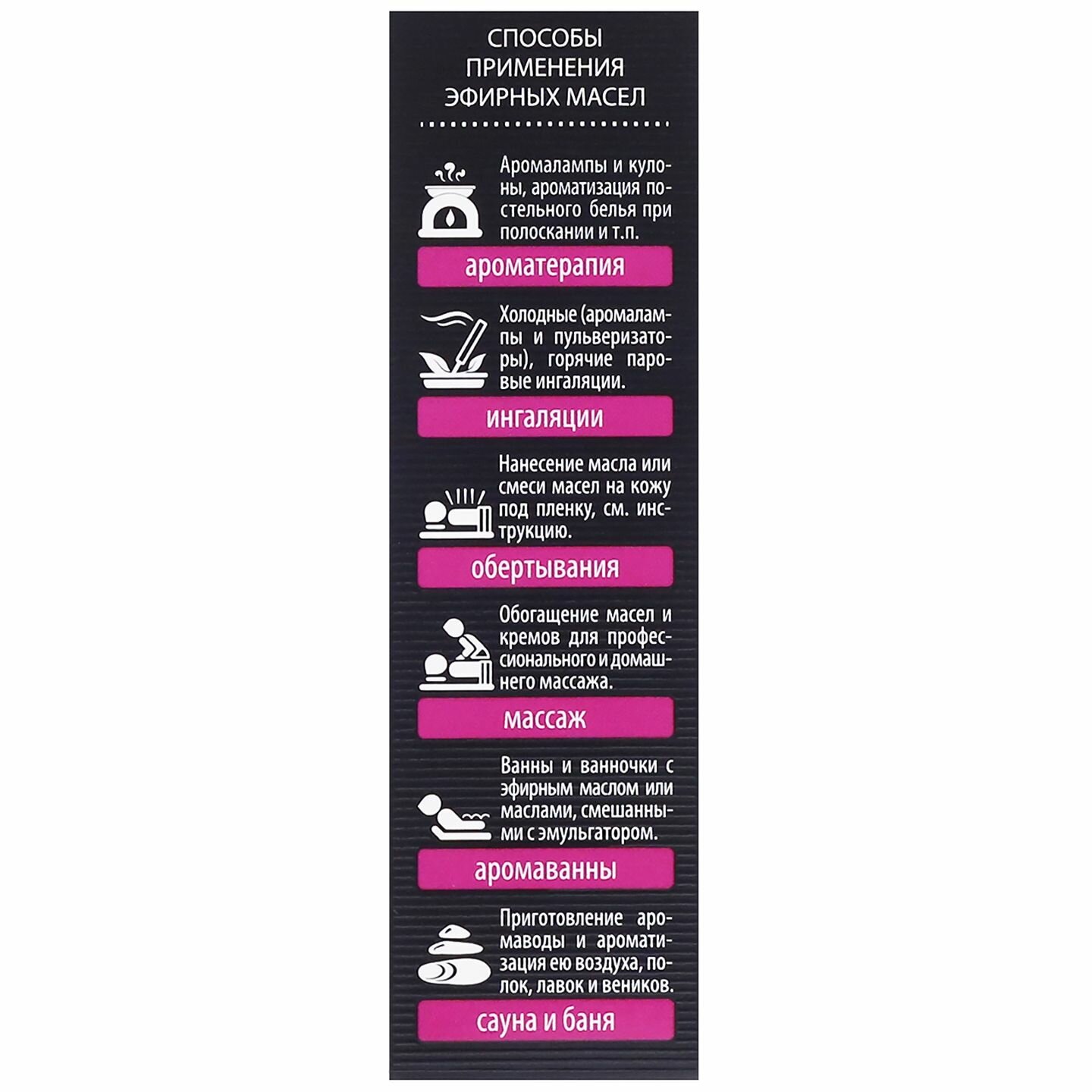 | Способ применения | Ароматерапия, ультразвуковой аромадиффузор, баня, ванна, косметика, массаж |