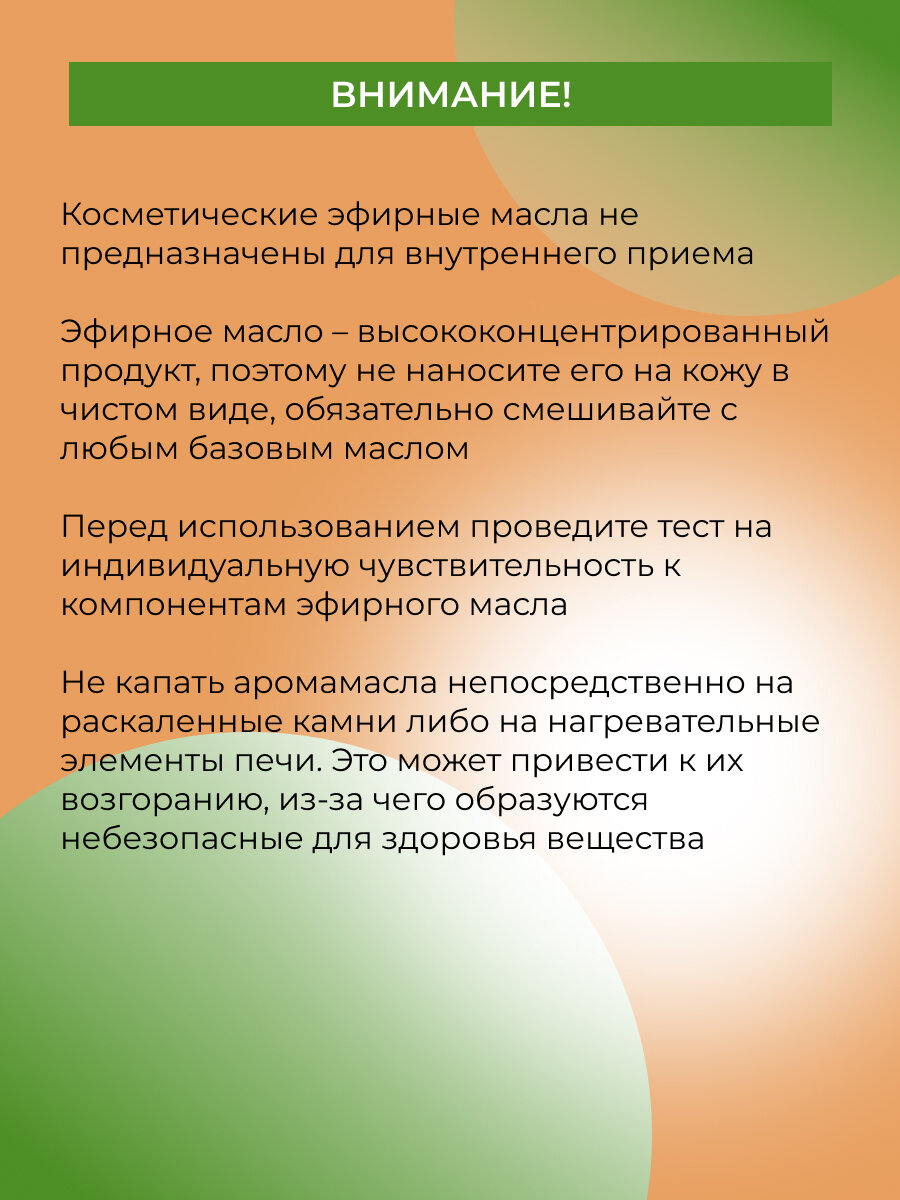 | Меры предосторожности | Индивидуальная непереносимость отдельных компонентов эфирной смеси. |