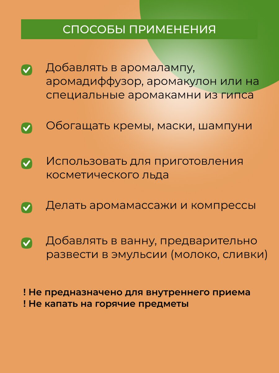 | Способ применения | Добавлять в аромалампу, аромадиффузор, аромакулон или на аромакамни; добавлять в ванну; добавлять в масло для массажа во время романтической прелюдии. Для наружного применения. |