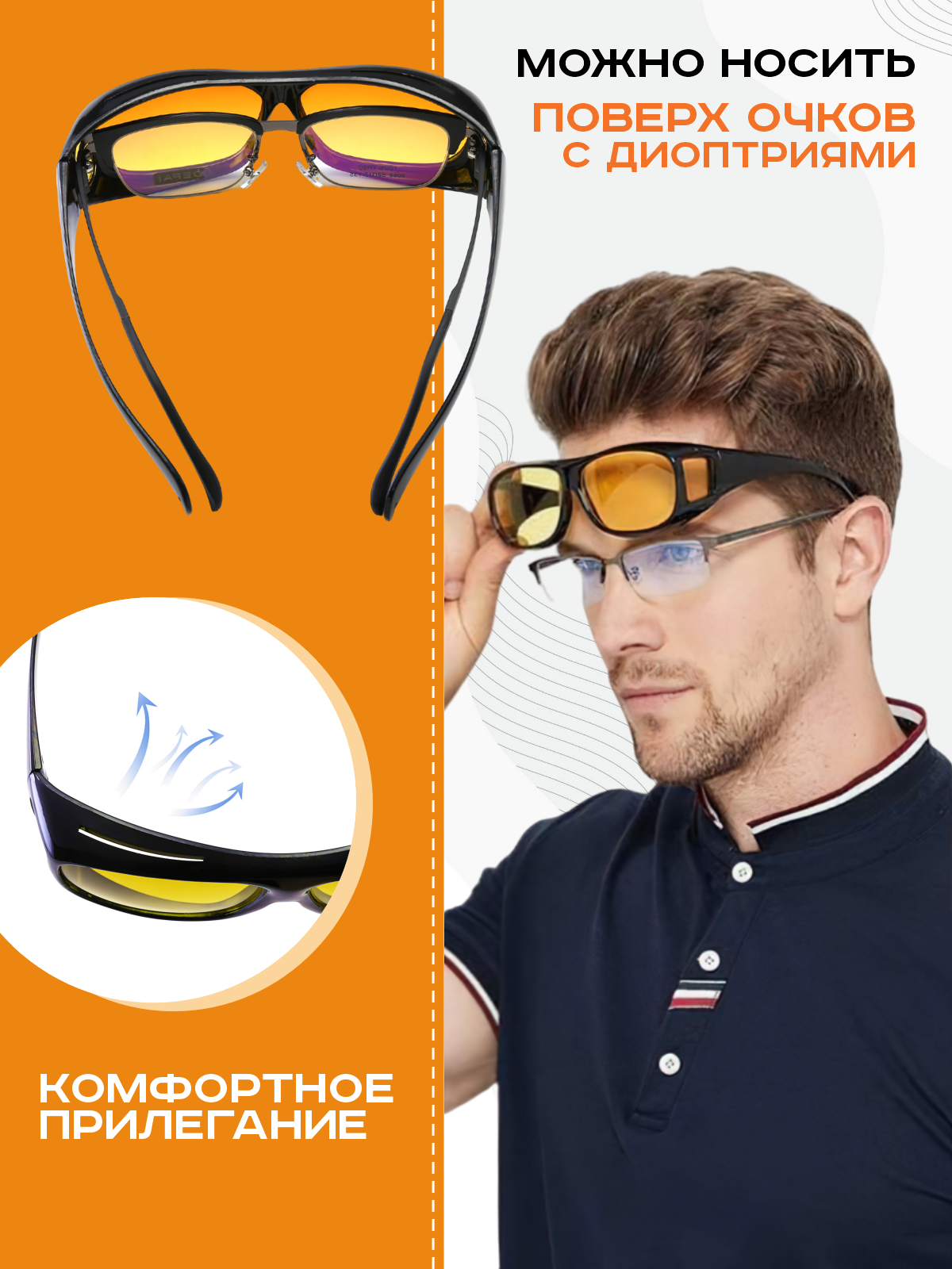 Мужские зеркальные очки ночного видения для вождения антиблик антифары пыленепроницаемые с защитой от ветра (Оранжевые)
