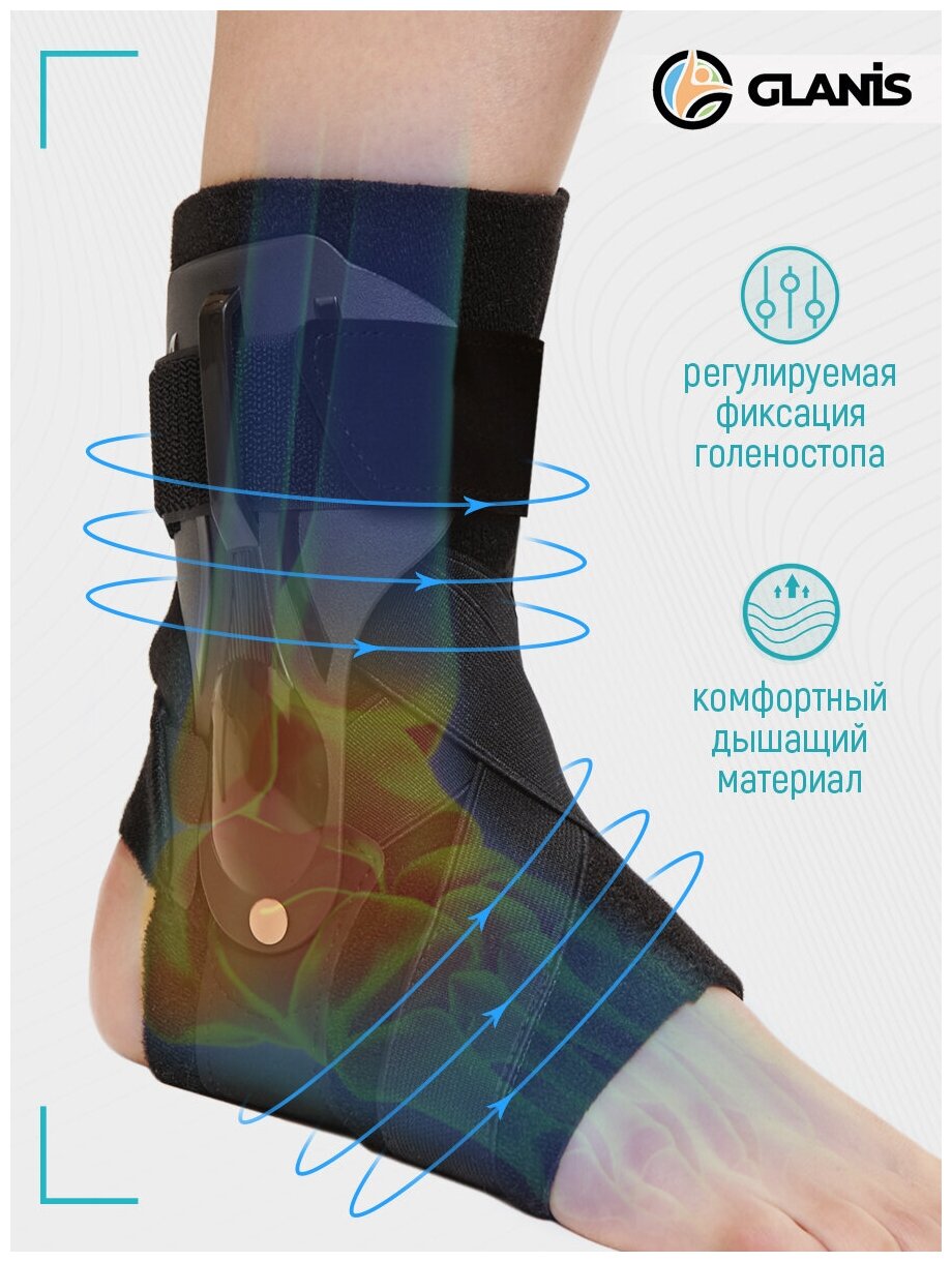 Glanis Бандаж голеностопный, фиксатор голеностопного сустава с ребрами жесткости, черный, размер S