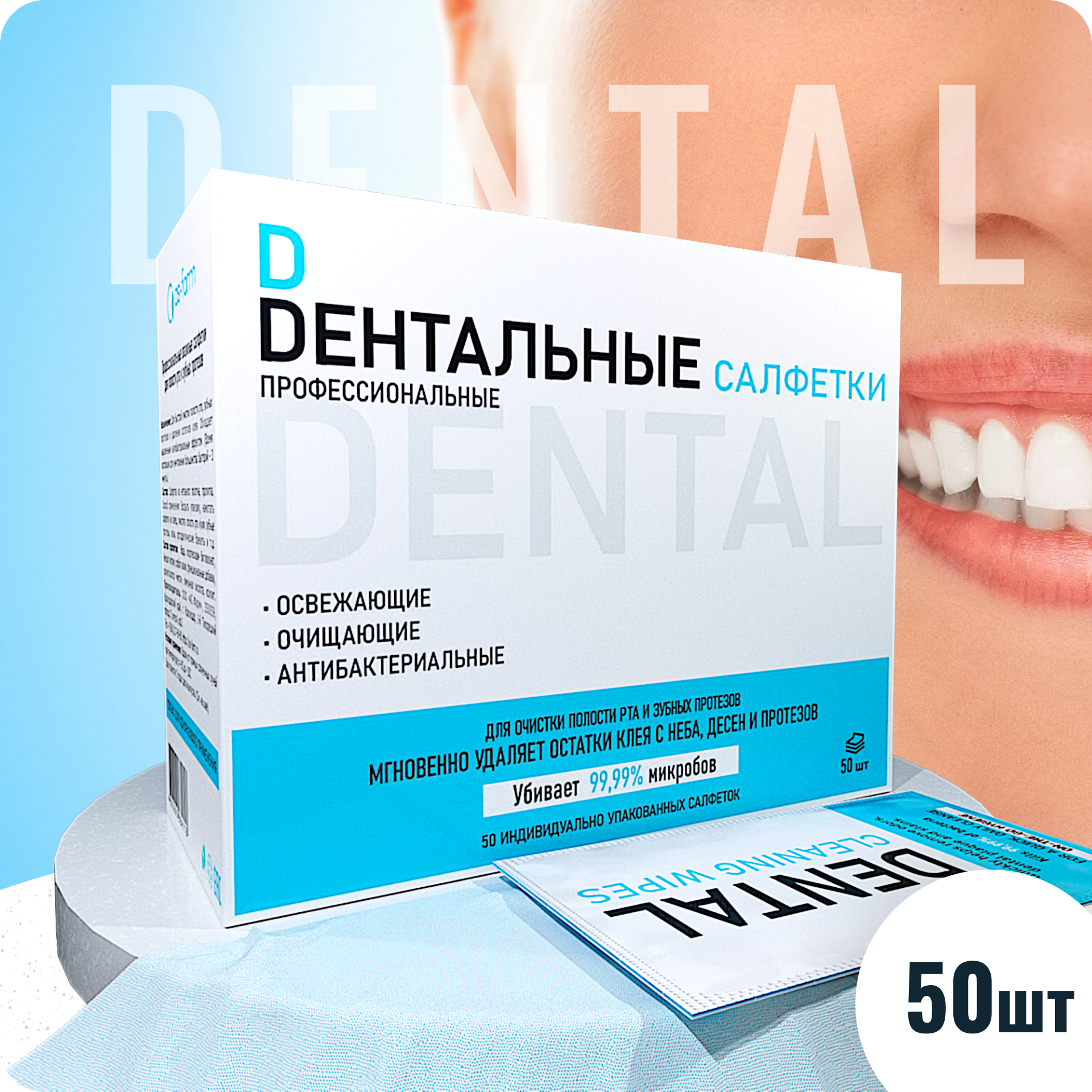 Дентальные салфетки (50 шт) для ухода за полостью рта, брекет системами, капами, коронками и протезами