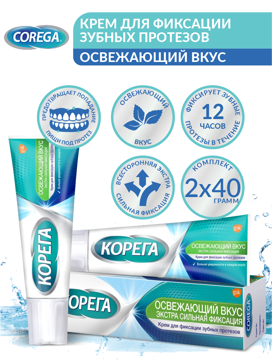 Корега Освежающий Вкус крем для всесторонней фиксации съемных зубных протезов с ультрасвежим мятным вкусом, 40 г*2 шт интересное:
