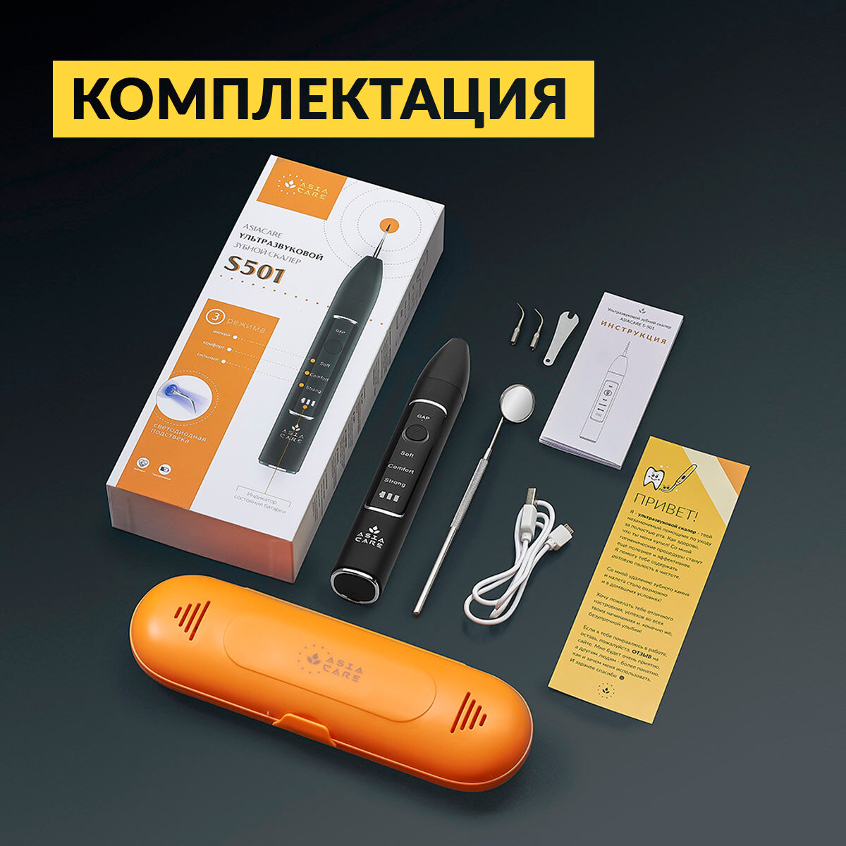 | Подробная комплектация | Скалер, зеркальце, контейнер, инструкция |
