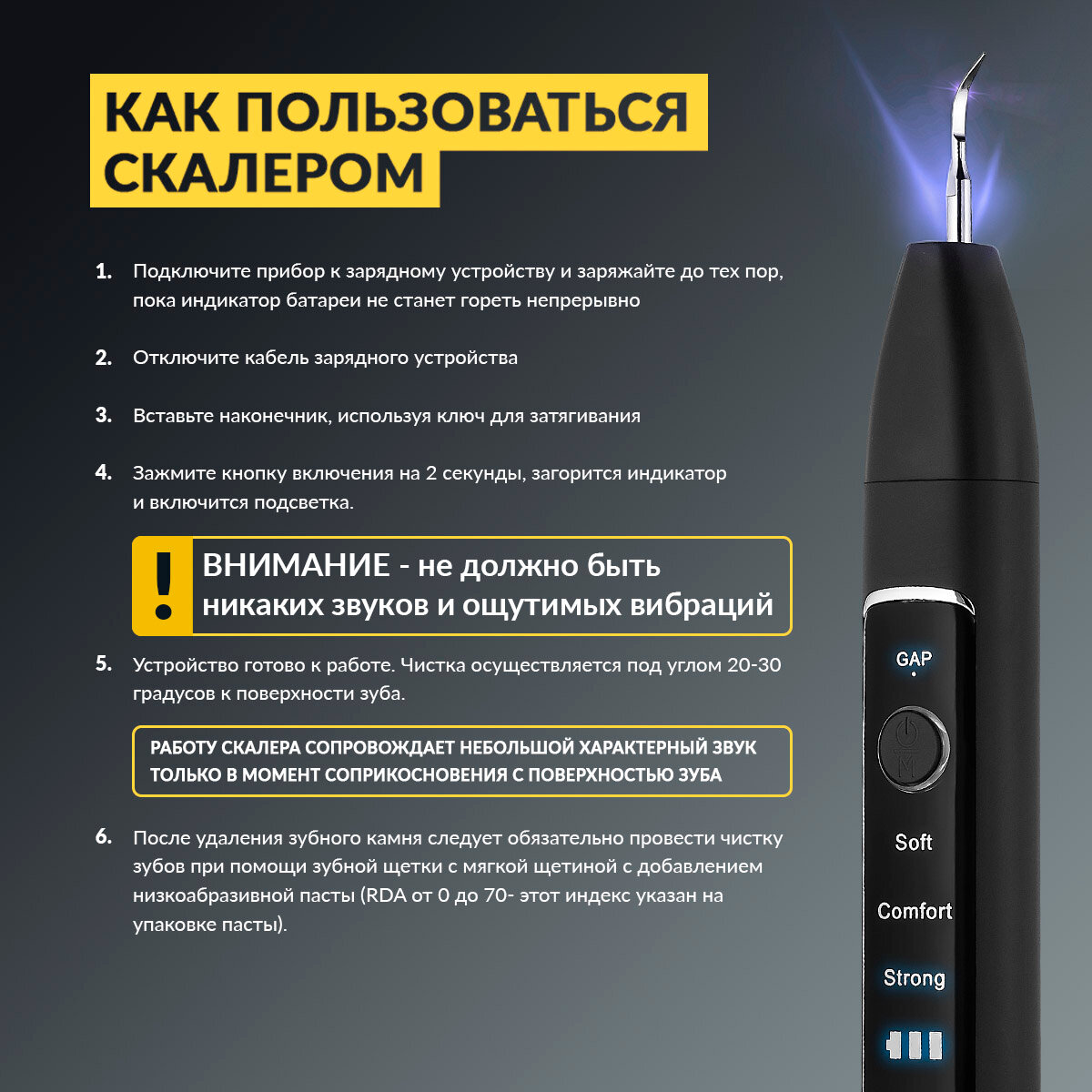 | Способ применения | Скалер включается двухсекундным нажатием кнопки включения. Не стоит переживать, если скалер не издает звуки при включении - это не значит, что он сломан. Скалер не издает никаких звуков, пока не соприкоснется с поверхностью зуба. |