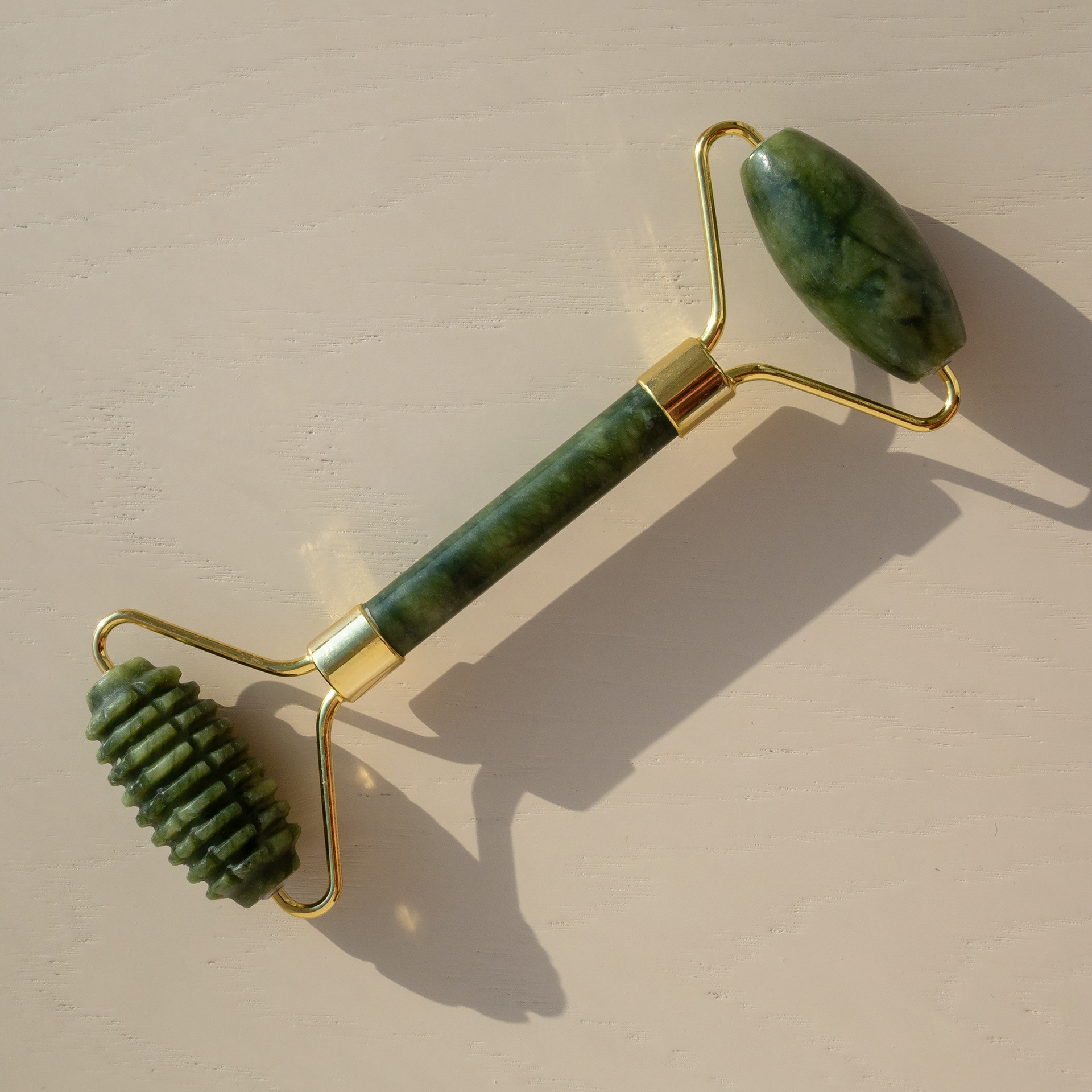 Ролик и скребок гуаша массажные из светло-зеленого нефрита (набор). Роллер и скребок нефритовые для массажа лица и тела. Подарок девушке на День влюбленных и 8 Марта