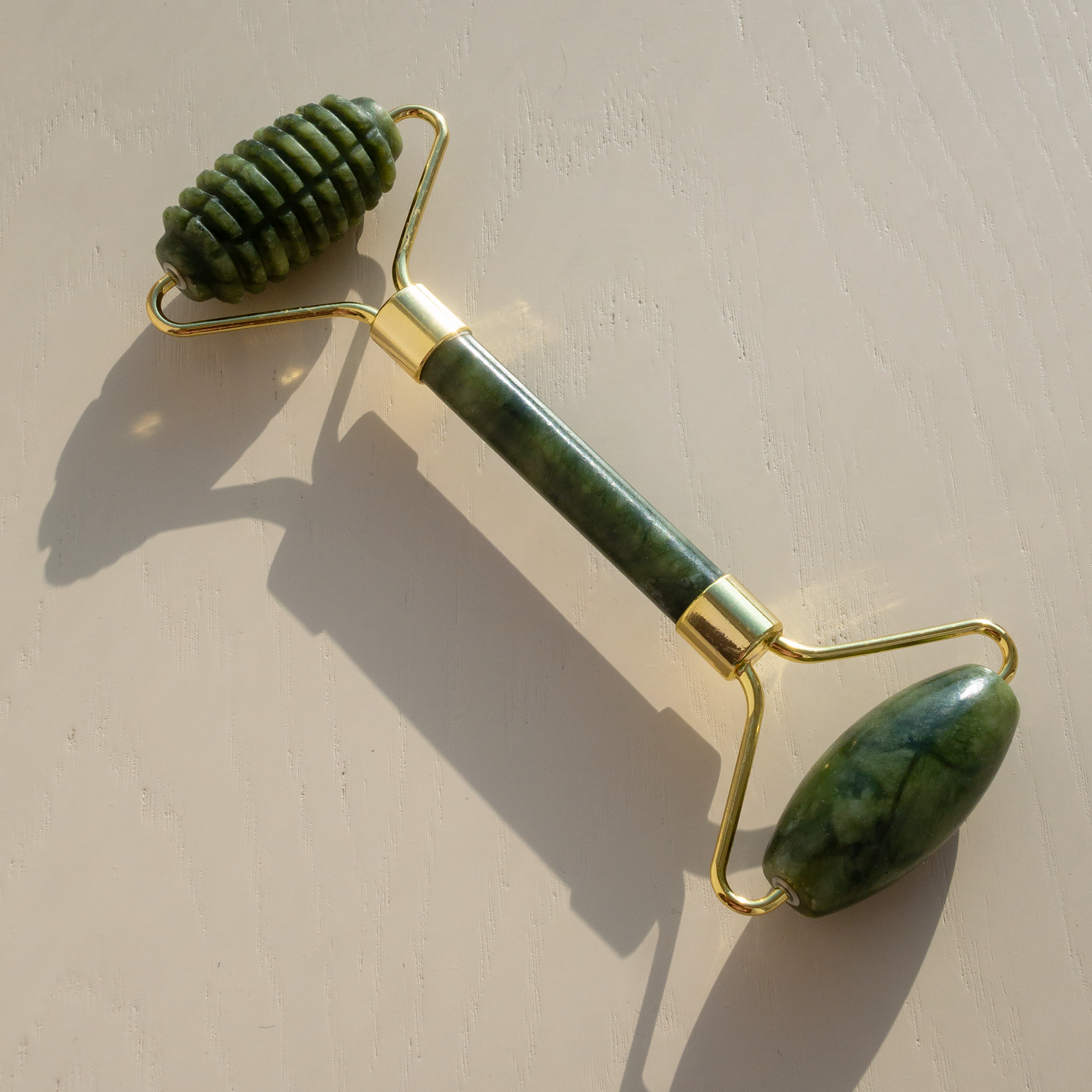Ролик и скребок гуаша массажные из темно-зеленого нефрита (набор). Роллер и скребок нефритовые для массажа лица и тела. Подарок девушке на День влюбленных и 8 Марта