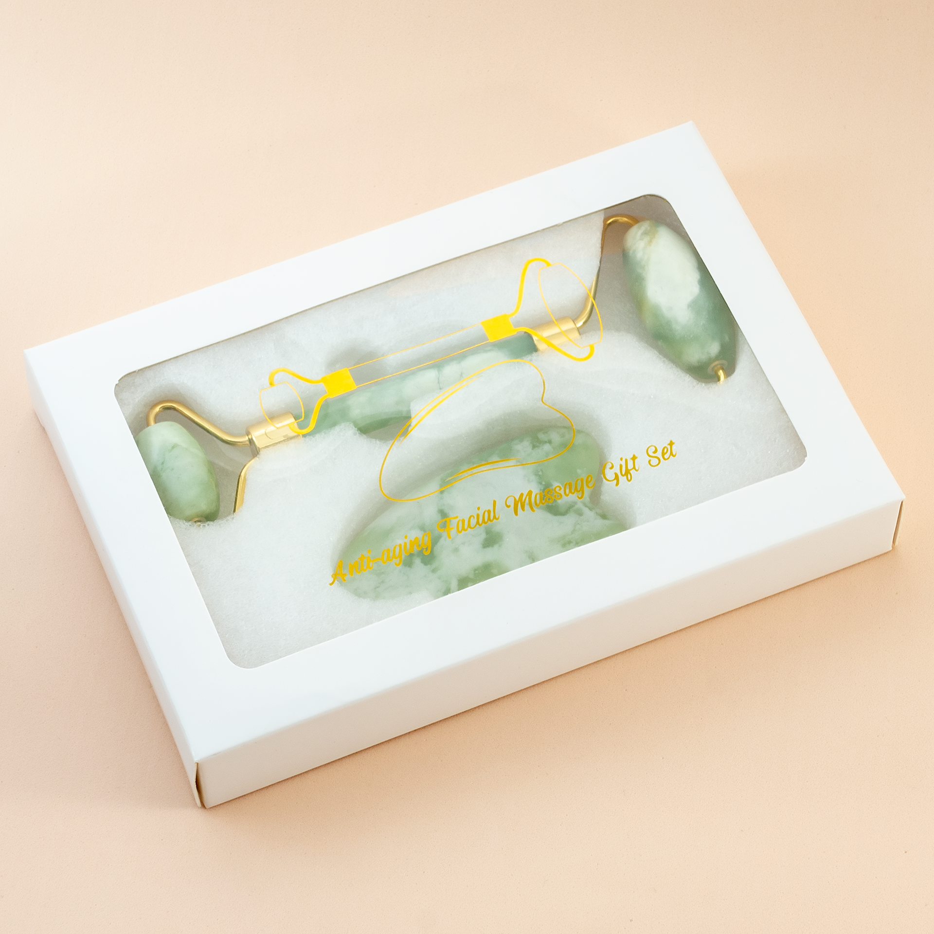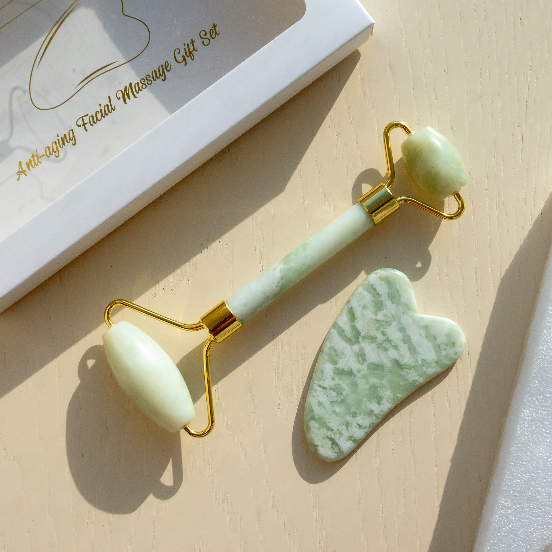 Ролик и скребок гуаша массажные из светло-зеленого нефрита (набор). Роллер и скребок нефритовые для массажа лица и тела. Подарок девушке на День влюбленных и 8 Марта
