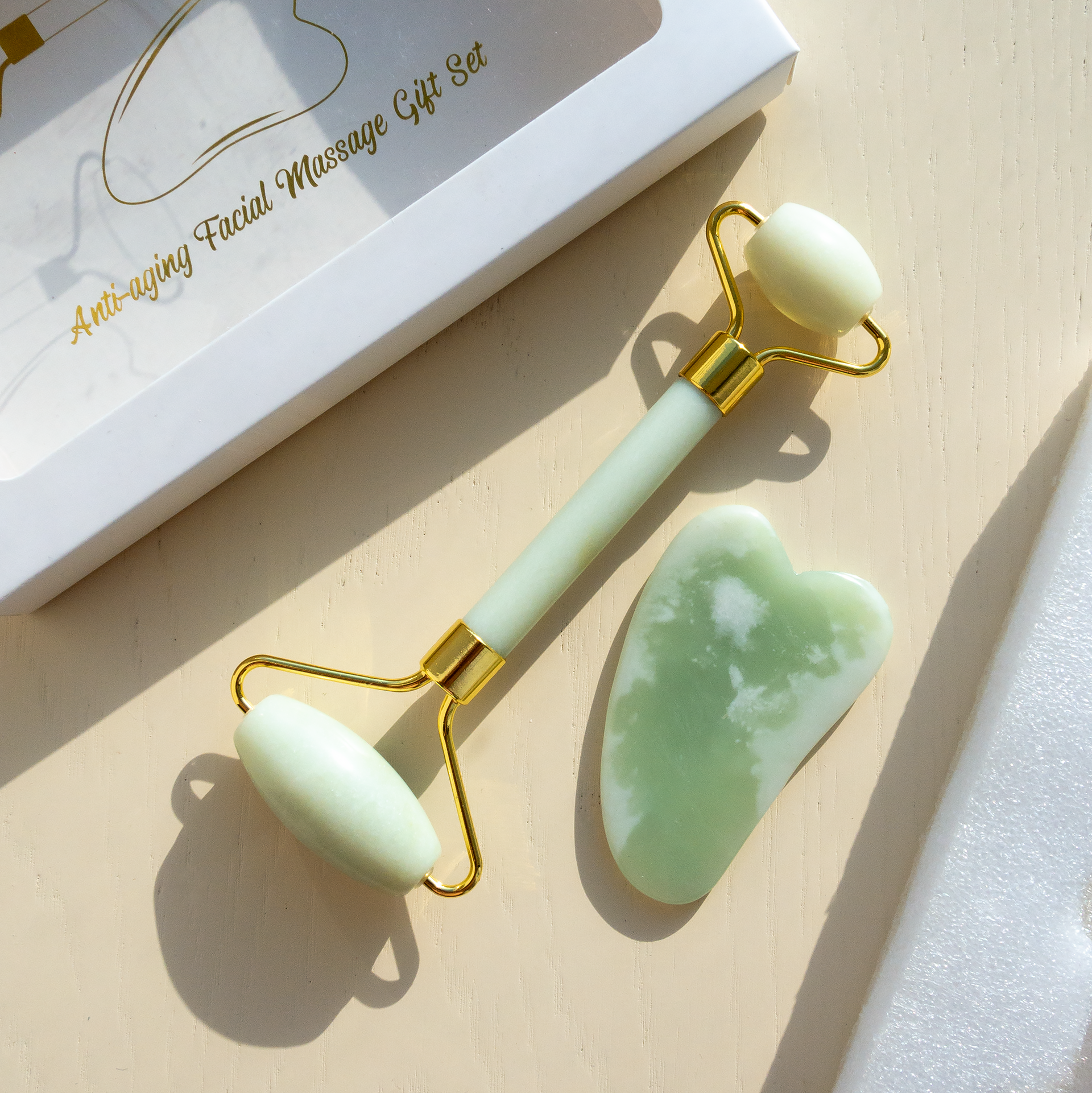 Ролик и скребок гуаша массажные из бело-зеленого нефрита (набор). Роллер и скребок нефритовые для массажа лица и тела. Подарок девушке на День влюбленных и 8 Марта