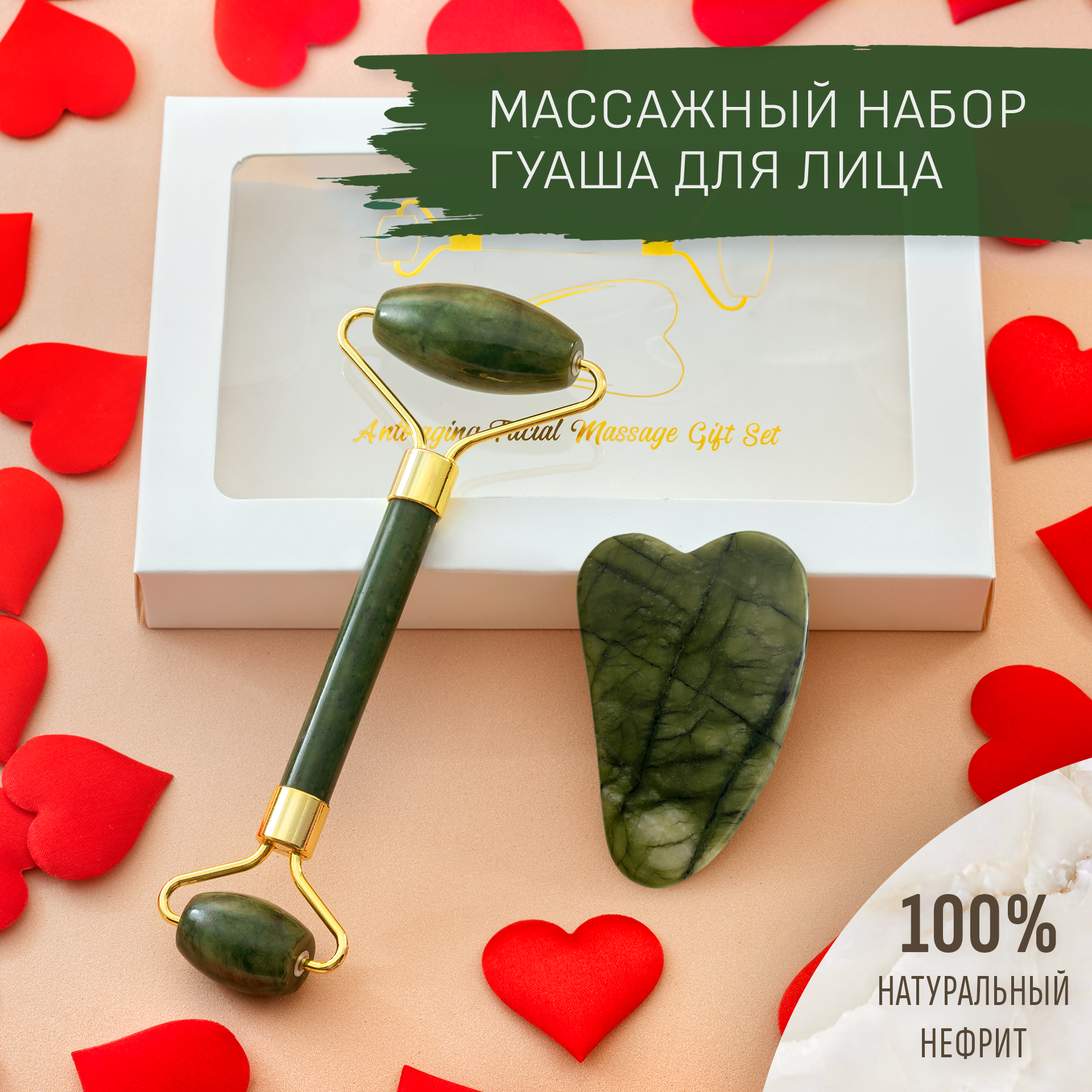 Ролик и скребок гуаша массажные из бело-зеленого нефрита (набор). Роллер и скребок нефритовые для массажа лица и тела. Подарок девушке на День влюбленных и 8 Марта