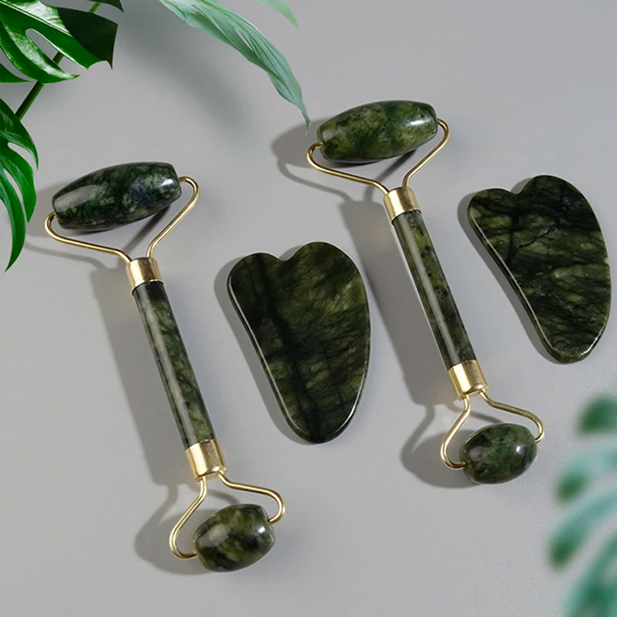 Ролик и скребок гуаша массажные из светло-зеленого нефрита (набор). Роллер и скребок нефритовые для массажа лица и тела. Подарок девушке на День влюбленных и 8 Марта