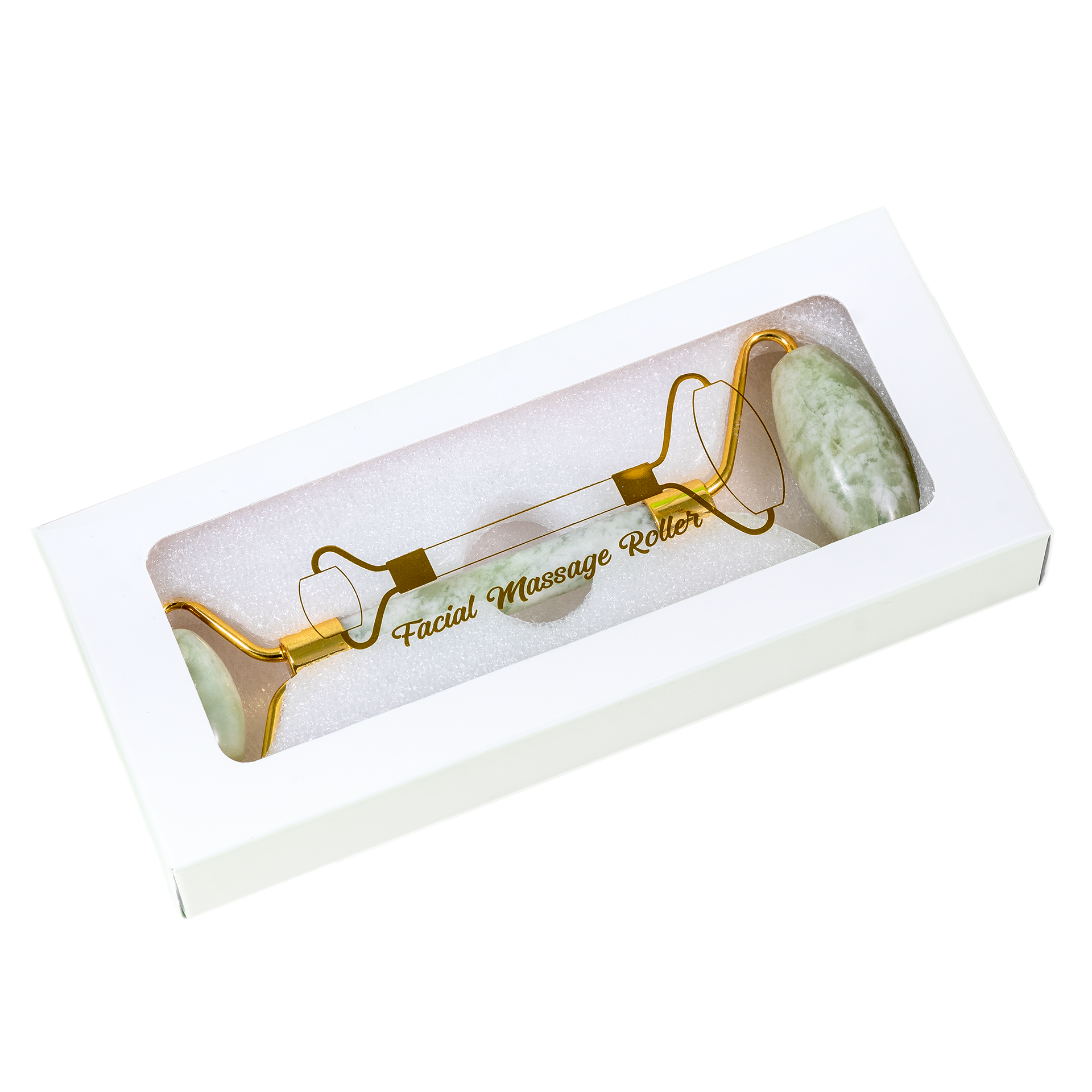 Ролик и скребок гуаша массажные из бело-зеленого нефрита (набор). Роллер и скребок нефритовые для массажа лица и тела. Подарок девушке на День влюбленных и 8 Марта