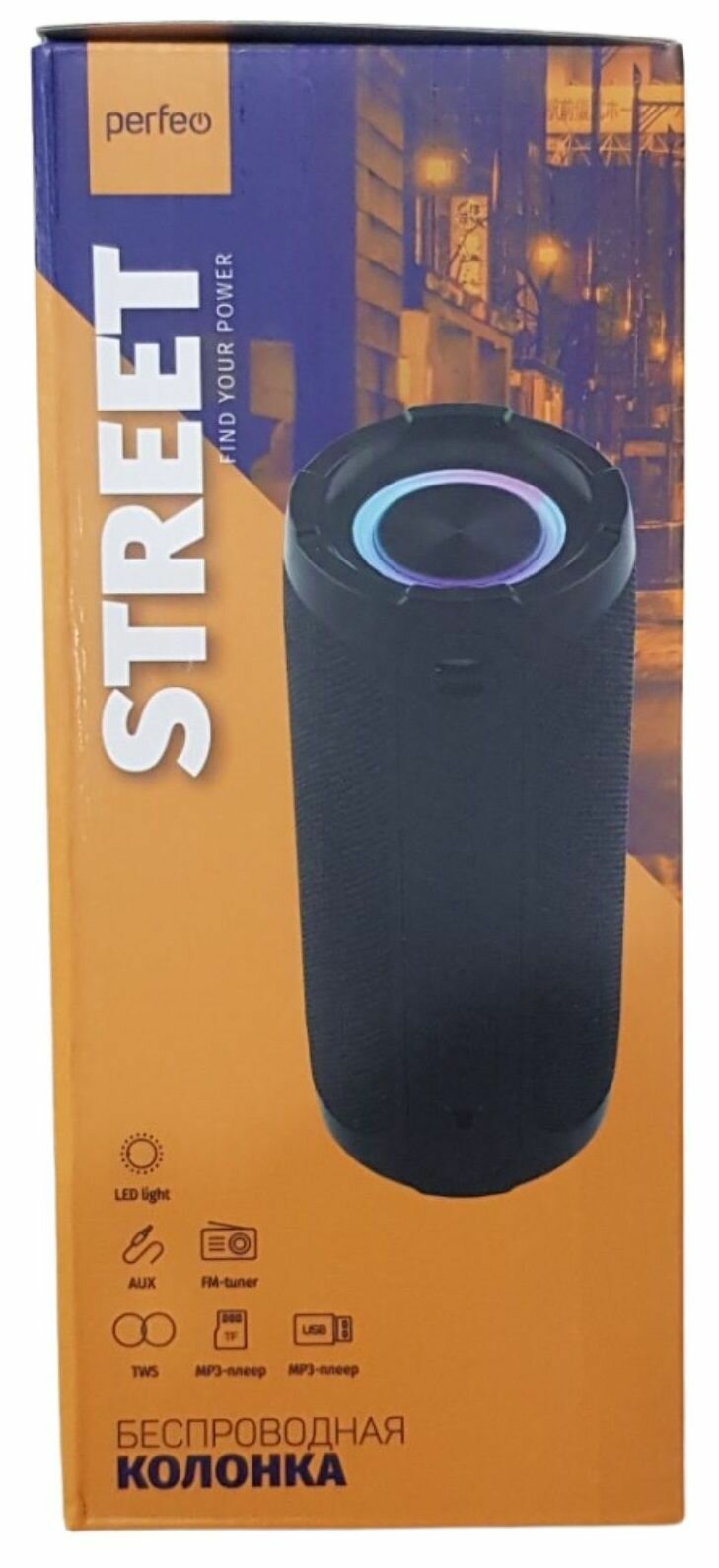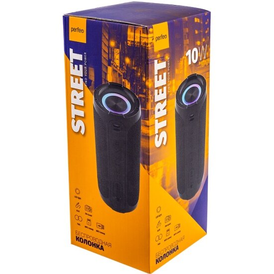 Колонка беспроводная портативная Bluetooth Perfeo "STREET" FM-радио, MP3-плеер USB/TF(microSD), AUX, TWS, LED, HF, 10Вт, 1800mAh, черная