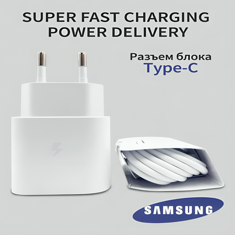 Адаптер для Samsung 25W USB-C + Кабель Type-C (3A), быстрая зарядка