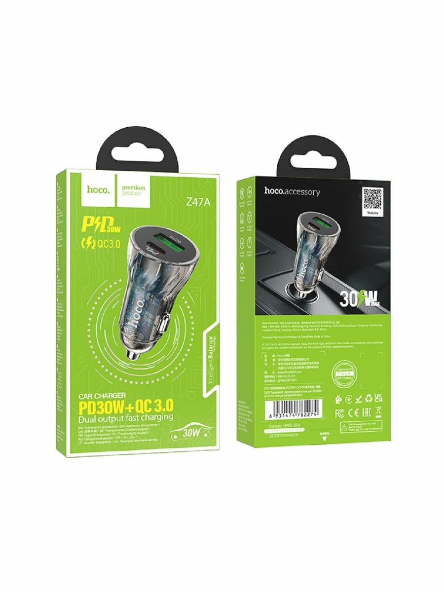 АЗУ HOCO Z47A Transparent 1xUSB, 1xUSB-C, 3А, PD30W, QC3.0 (черный)