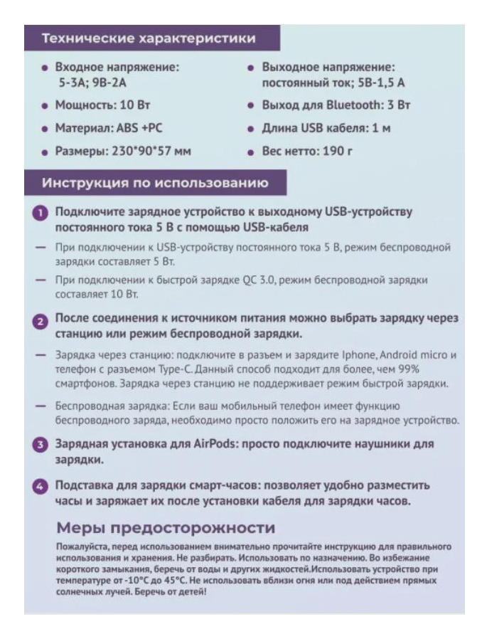 | Дополнительная информация | для 1 телефона, для 2 телефонов, для планшета, зона для Apple Watch, зона для беспроводных наушников, зона для умных часов |